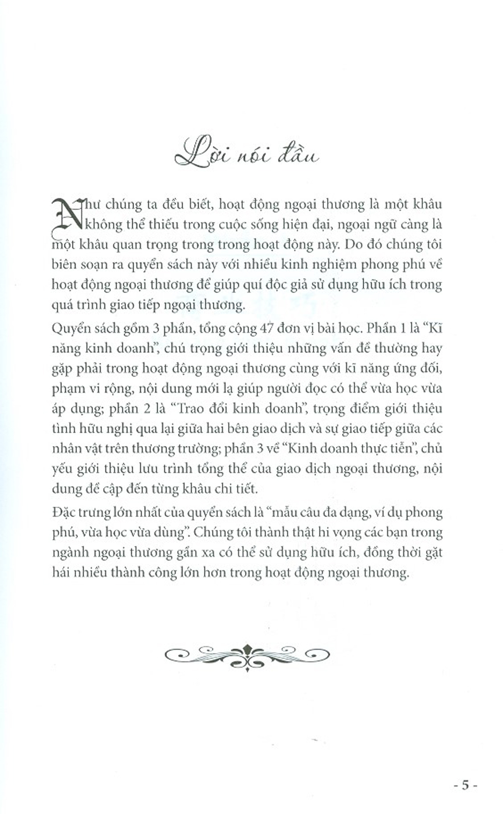 Như chúng ta đều biết, hoạt động ngoại thương là một khâu không thể thiếu trong cuộc sống hiện đại, ngoại ngữ càng là một khâu quan trọng trong trong hoạt động này. Do đó chúng tôi biên soạn ra quyển sách này với nhiều kinh nghiệm phong phú về hoạt động ngoại thương để giúp quý độc giả sử dụng hữu ích trong quá trình giao tiếp ngoại thương.