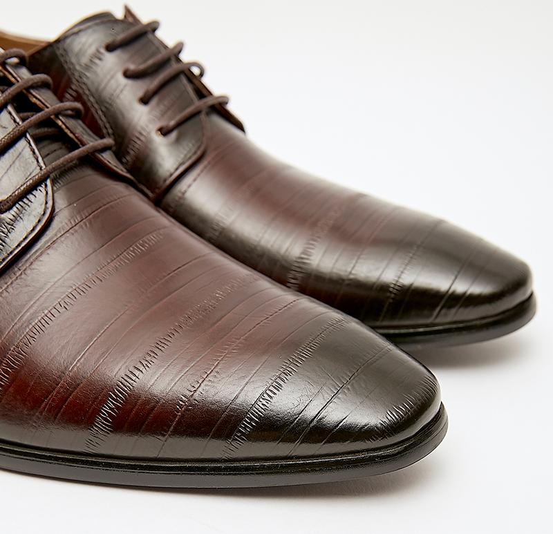 - Thiết kế giày derby sang trọng dành cho quý ông. - Chất liệu da bò thượng hạng được dập vân da trăn giúp sản phẩm của bạn thêm phần đẳng cấp và thanh lịch.
