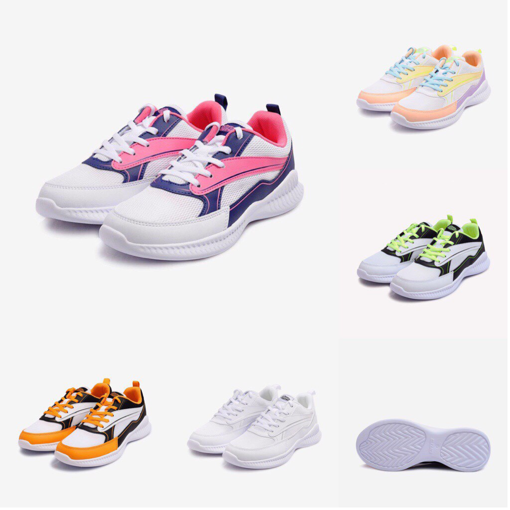 Đế giày - lựa chọn chất liệu Phylon làm nên đế giày thể thao cho các chị em. Vì tính chất nổi bật của vật liệu này là trọng lượng siêu nhẹ (nặng chỉ 300g/chiếc) và độ đàn hồi cao. Nhờ đó, phần lớn khách hàng sử dụng sản phẩm ngay từ lần đầu tiên đều có cảm giác đôi chân “nhẹ như bay”, bước đi thoải mái và thỏa thích vận động ở mọi tư thế theo cách riêng mà không lo đau mỏi chân. - Mặt đế thiết kế thêm những rãnh chống trượt, bố trí dày đặc nhằm tăng độ ma sát. Qua đó giúp người mang vận động thoải mái, bước đi vững chắc và bảo đảm an toàn tối đa, nhất là khi di chuyển trên những địa hình trơn nhẵn hoặc thời tiết ẩm ướt. Thân giày - Thân giày áp dụng công nghệ đan 2 sợi độc đáo. Nhờ vậy, sản phẩm vô cùng nhẹ và thoáng, mang lại cảm giác thoải mái nhất có thể cho người sử dụng. Không những vậy, công nghệ đan 2 sợi còn bảo đảm độ bền chặt của từng chi tiết như cổ giày, quai giày, dây giày… giữ đúng form dáng lâu dài, ít biến dạng hoặc giãn sau một thời gian sử dụng. - Bên cạnh đó, thiết kế thân giày được cải tiến mạnh mẽ bằng chất liệu vải canva, bảo đảm cảm giác thoải mái nhất có thể và hạn chế nóng bức, bí bách nếu phải mang giày trong thời gian dài. -