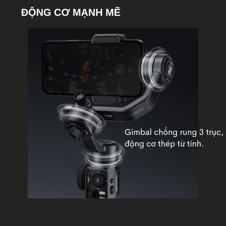 - Hiệu suất động cơ mạnh mẽ Thiết kế ổn định 3 trục cho phép người dùng ghi lại những cảnh quay mượt mà và ổn định bằng chính chiếc điện thoại của mình. Trang bị động cơ thép từ tính chuyên nghiệp kết hợp thuật toán cao cấp giúp cân bằng tối ưu góp phần nâng cao hiệu quả quay chụp. Động cơ nằm ở phía sau giúp hạn chế tối đa sự cản trở có thể gặp phải trong quá trình quay phim. Hỗ trợ cuộn và nghiêng tăng cường phạm vi di chuyển góc nhìn camera bao quát. Kết hợp các chuyển động tự do giúp cho người dùng ghi lại những cảnh quay từ mọi góc nhìn ngay cả góc thấp hoặc góc siêu rộng. Chống rung 3 trục