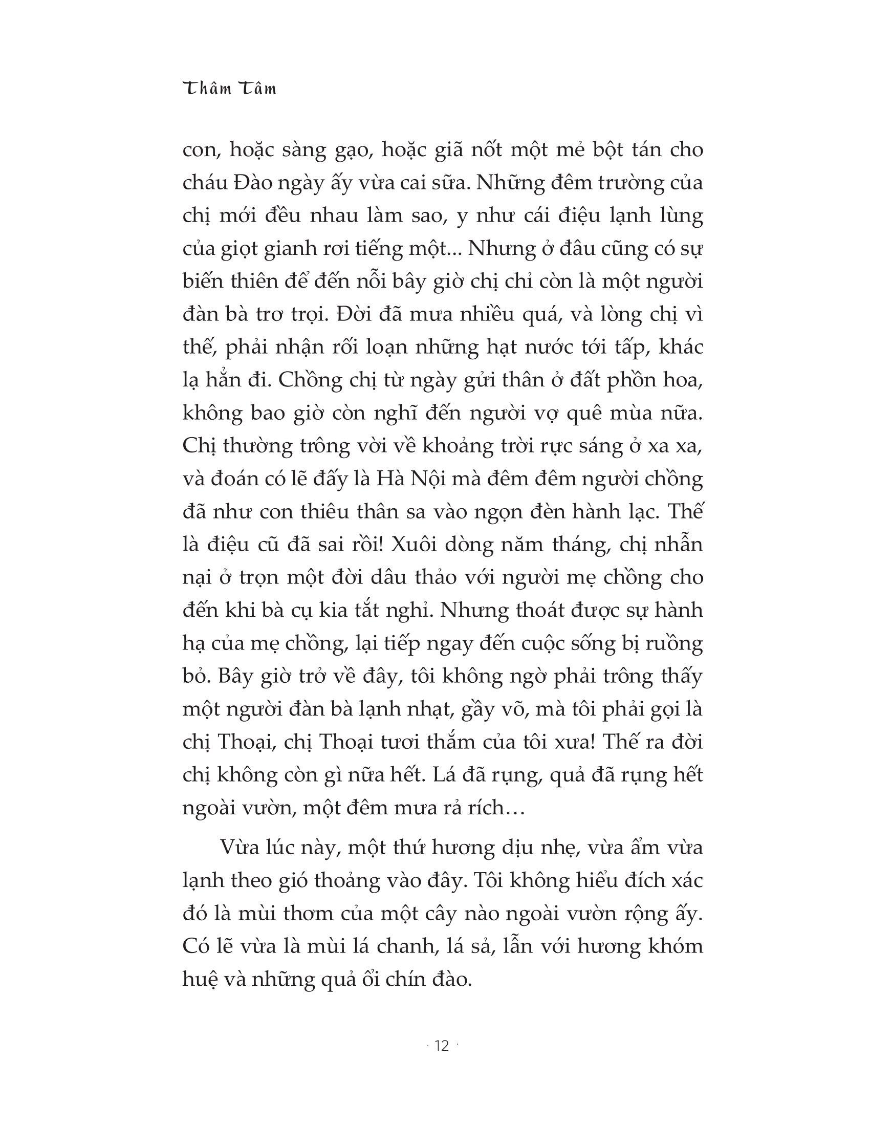 Chúng đã quá cái độ tươi cười rồi. Cánh mảnh, nhụy mòn, cuống lả xuống và đài quắt đi, đóa hoa thật là gầy và ốm. Cúc không còn chủ nhân, cúc chỉ còn những bóng chiều một đi một mất… Ấy là đời một người đàn bà góa.