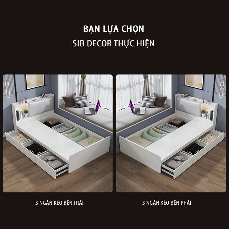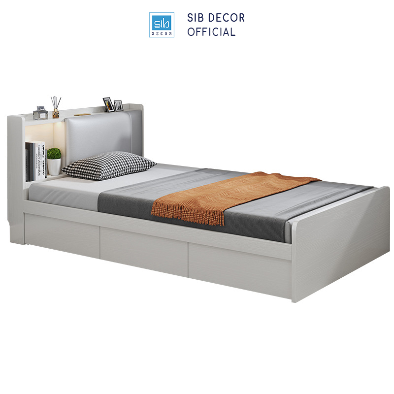 ✨Giường Gỗ Đơn Dài 1.2m Phối Đèn LED và 3 Ngăn Kéo Màu Trắng SIB Decor GN14