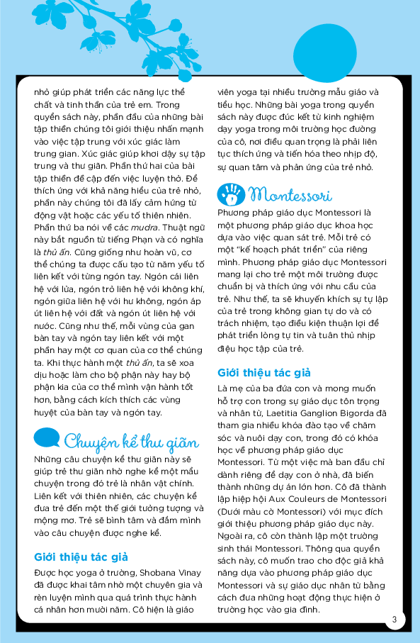 "Cả năm vui khỏe cùng con" thuộc bộ sách "Giúp con hạnh phúc" đã thống kê hơn 200 hoạt động có tác dụng làm tâm trí thư thái để bố mẹ chơi cùng con. Các hoạt động được phân bổ theo 52 tuần và chia thành 5 phần: hoạt động sáng tạo, thiền, kể chuyện và phương pháp giáo dục Montessori. Như thế, bố mẹ sẽ có thể lựa chọn ưu tiên cho những lúc chia sẻ thân mật với con thông qua nhiều hoạt động (đọc truyện, tập thể dục, vẽ, làm thủ công, ). Cả nhà có thể bắt đầu bất cứ lúc nào trong năm. Sách thiết kế theo lộ trình giúp trẻ tiến bộ dần dần theo từng mức độ xác định.