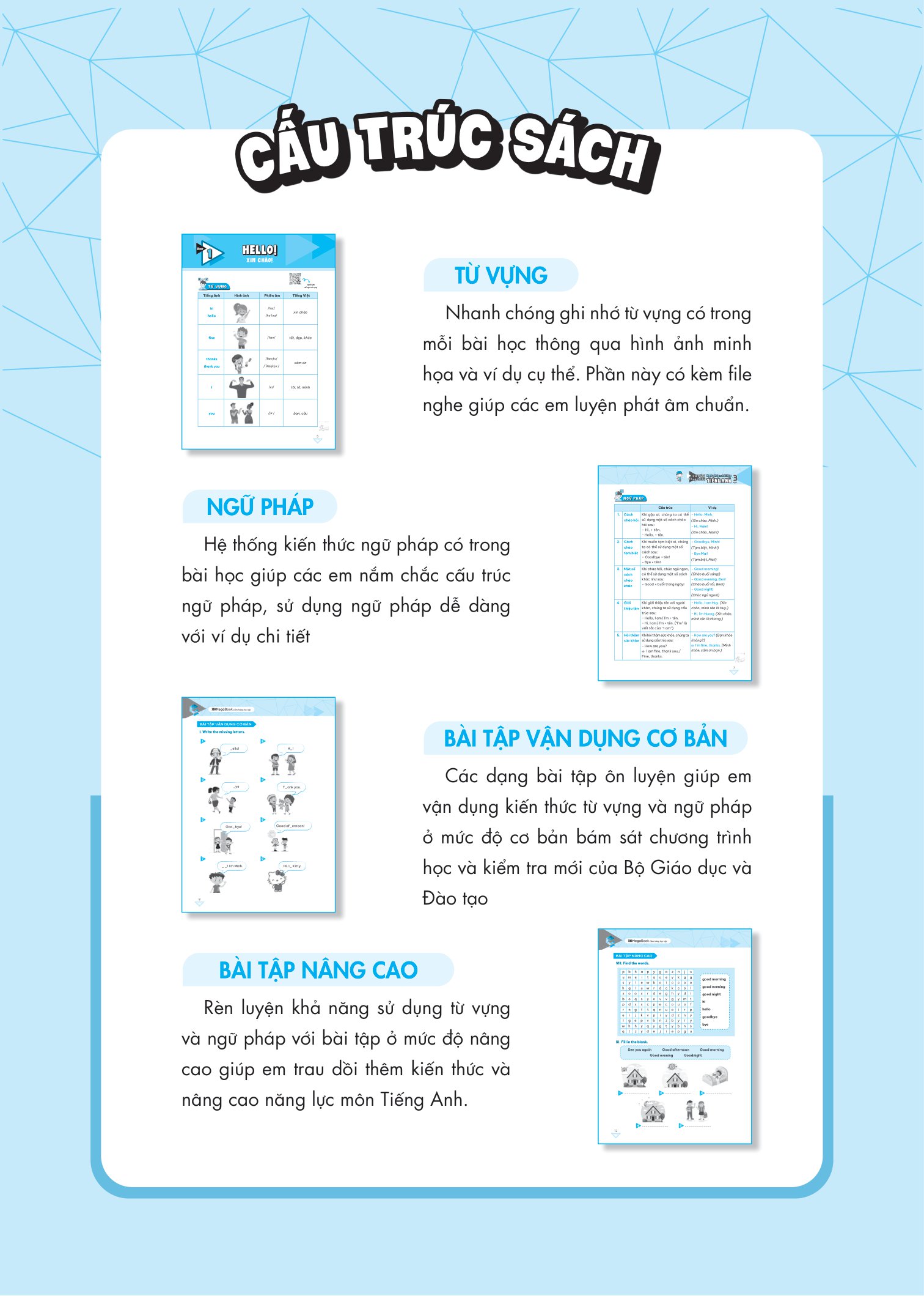 Bộ sách biên soạn thành 2 tập, mỗi tập gồm 15 chủ đề từ vựng. Bài học có hệ thống từ vựng - cấu trúc và bài tập thực hành đa dạng. Cung cấp phương