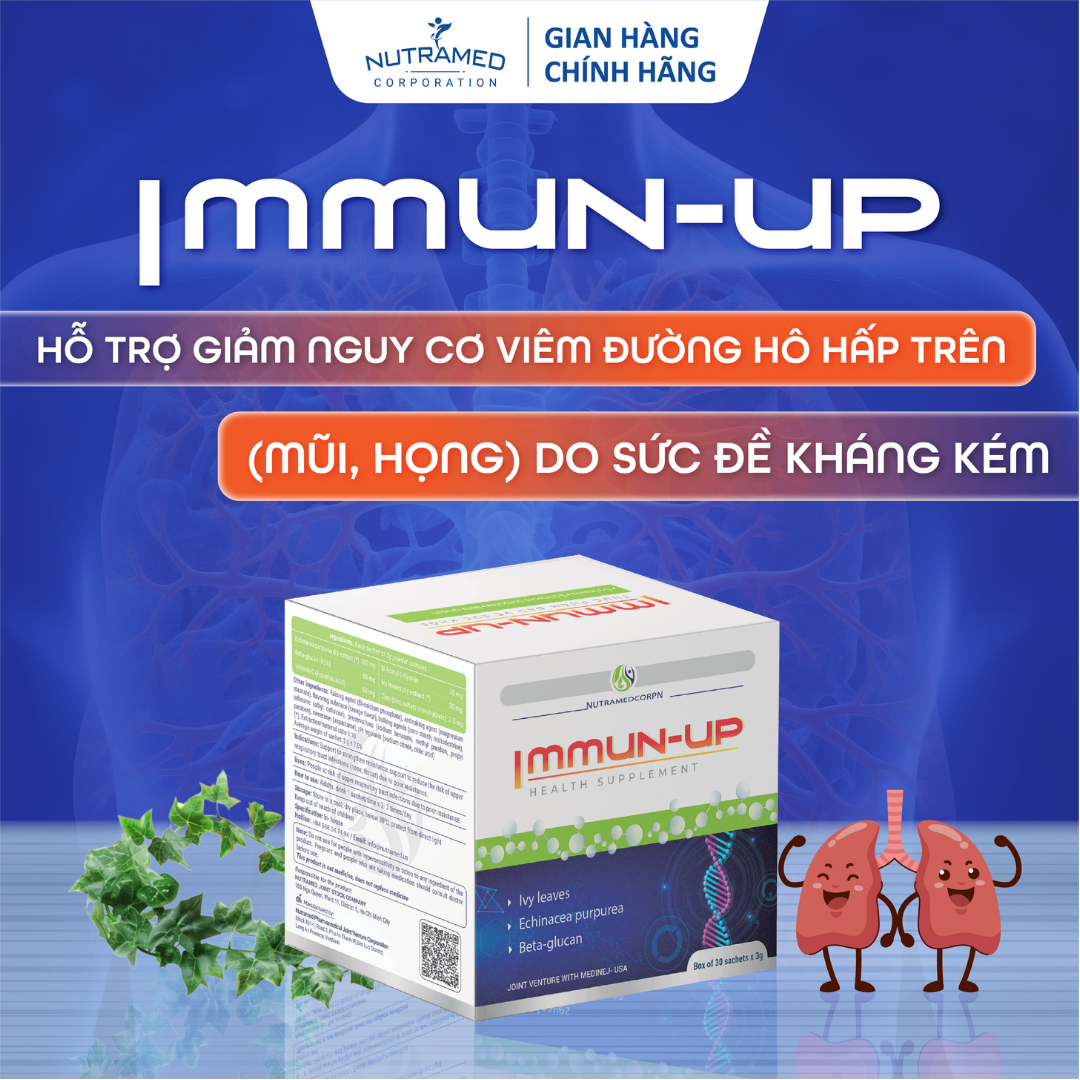 Immun-up gói bột uống giúp hỗ trợ nâng cao sức đề kháng, hỗ trợ cải thiện hệ thống miễn dịch, hỗ trợ hiệu quả cho viêm đường hô hấp trên như viêm họng, viêm phế