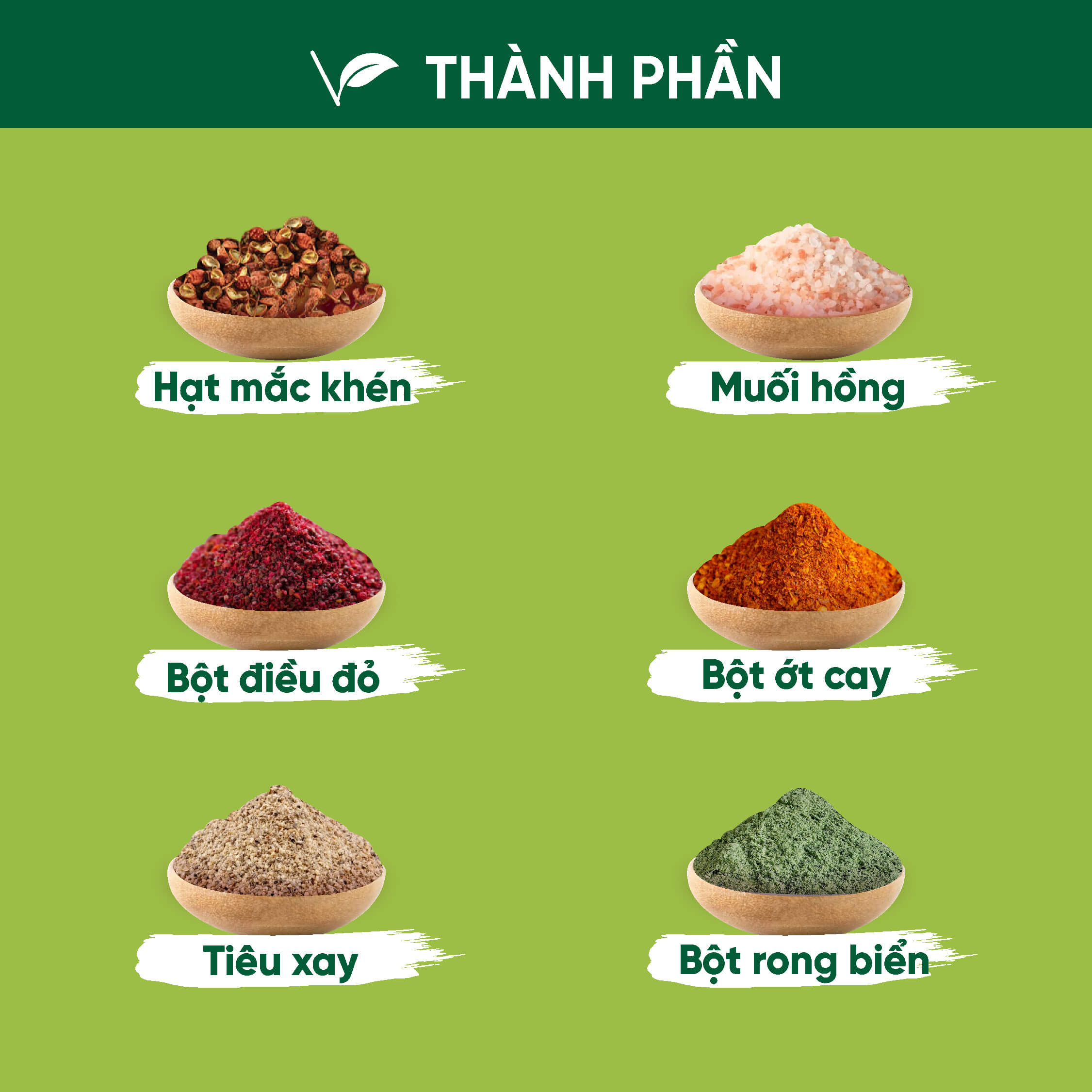 Thông tin sản phẩmThành phần chính: Muối sấy, đường cát, muối hồng, hạt mắc khén, bột ớt cay, bột chanh, lá chanh,...Năng lượng: 135 kcalKhối lượng tịnh: 10gHương vị: Cay the nhẹ, thơm đặc trưng m...