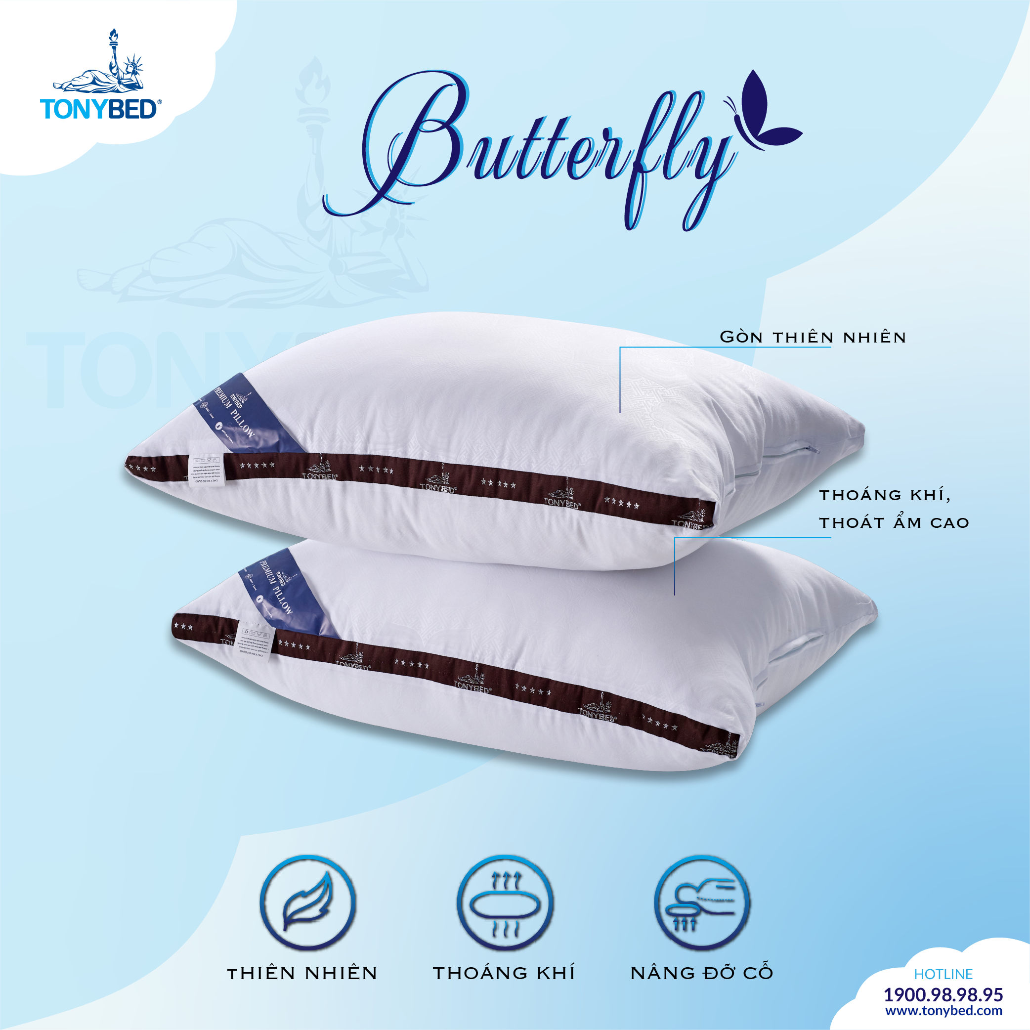 Gối Butterfly Được làm từ gòn bông bi cao cấp gồm những hạt gòn nhỏ, trò, có kích thước ngang nhau cùng với dây chuyền, máy móc hiện đại tạo nên những sản phẩm gối có hình dáng và độ êm ái, bền bỉ ưu việt. Tính năng: