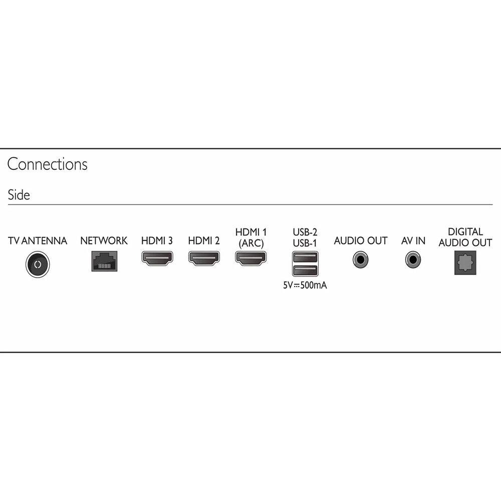 • Cổng kết nối: HDMI x 3 (HDMI ARC x 1), USB x 2, RJ45, Bluetooth 5.1, Wi-Fi 802.11ac, Cổng Audio out (optical)