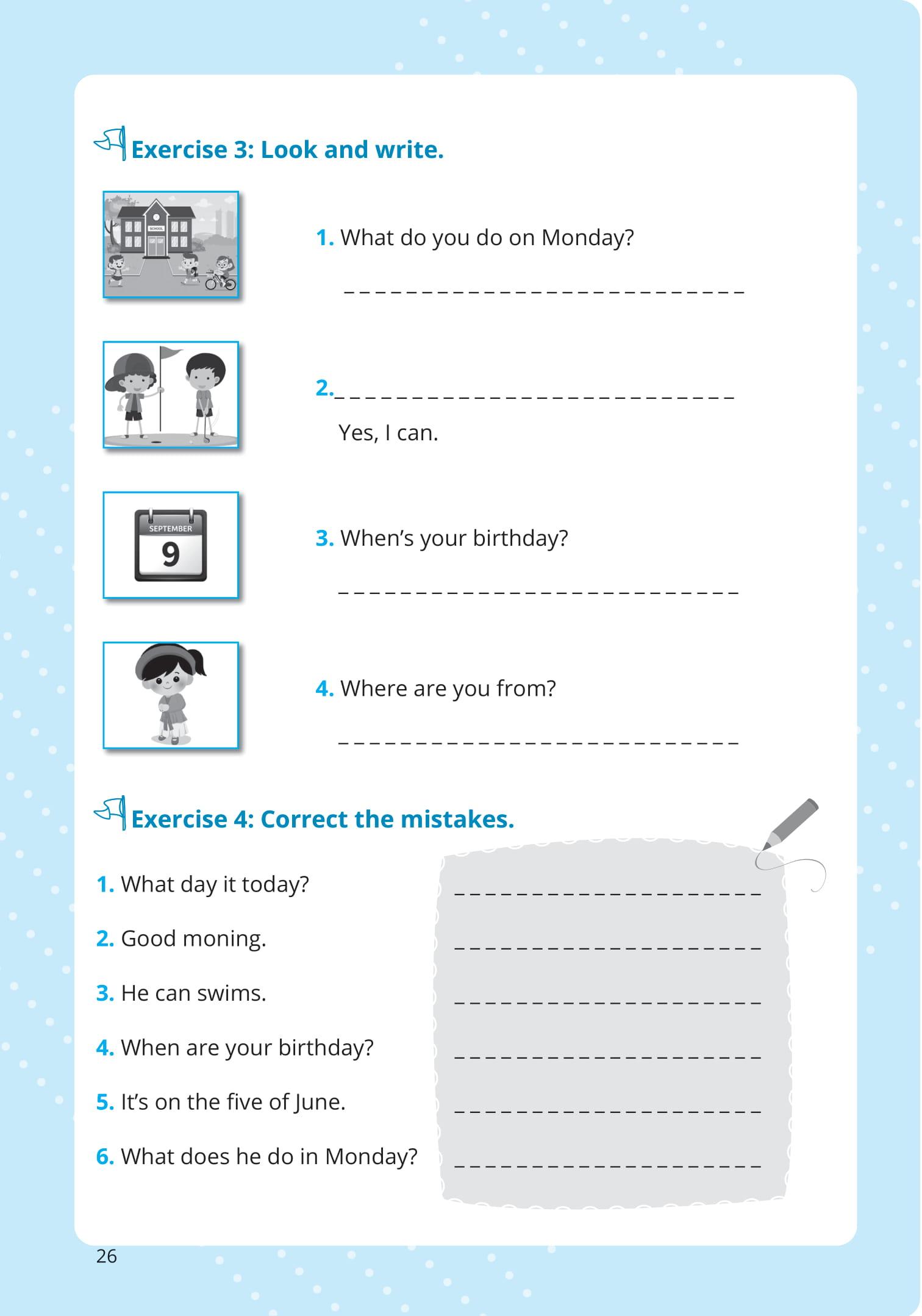 - “Học đi đôi với hành” – Bài tập thực hành đa dạng Để giúp các con hiểu sâu – nhớ lâu kiến thức và áp dụng được vào thực tế, các dạng bài tập thực hành rất phong phú: Bài tập nối (Match), điền từ vào chỗ trống, sửa lỗi sai, hoàn thành câu, dịch nghĩa…