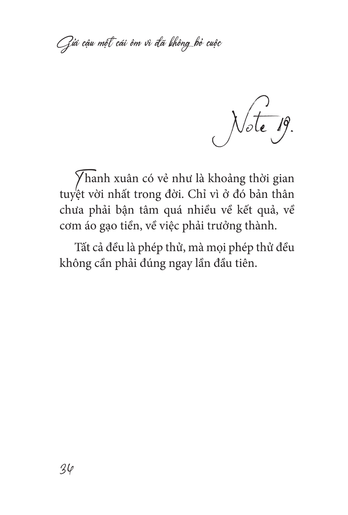 Mọi trải nghiệm, mọi hành trình đều là phép thử, mà phép thử thì không cần phải đúng ngay lần đầu tiên. Vậy nên hãy xem mọi phép thử là từng điểm mốc để chạm tới ước mong, để cậu có thể tự hào về bản thân vì đã luôn kiên cường không bỏ cuộc.