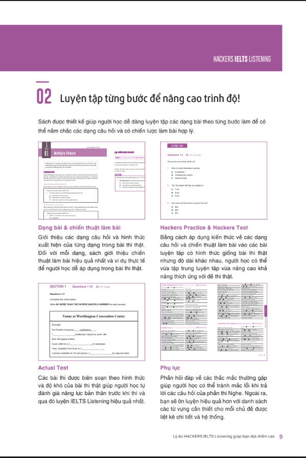 Hackers IELTS Listening Hackers IELTS Listening - Các bài nghe trong Hackers IELTS Listening được biên soạn dựa trên xu hướng ra đề mới nhất, các bài Actual Test cũng được biên soạn chính xác theo hình