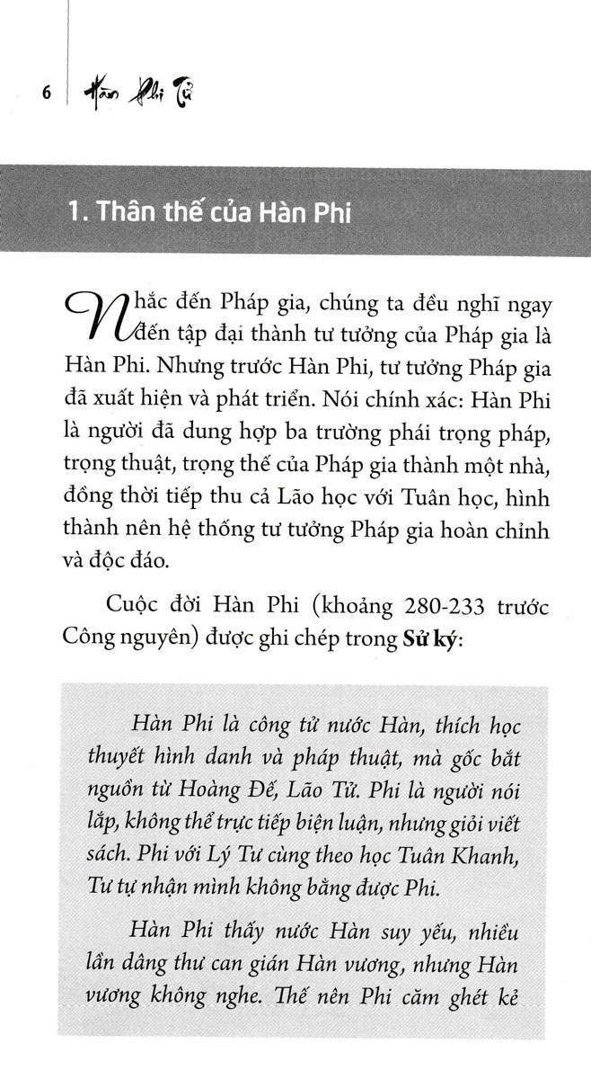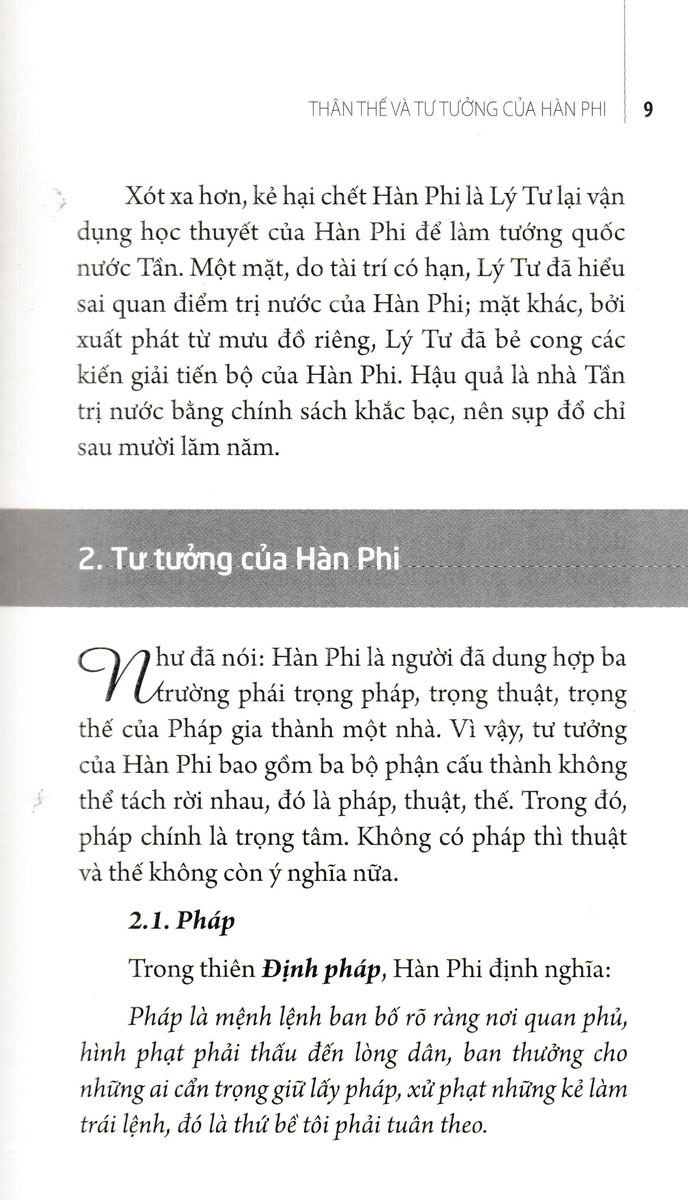 Cuốn sách do dịch giả Mặc Am dịch và biên soạn, tổng hợp những tư tưởng quan trọng của vị học giả lỗi lạc Hàn Phi Tử về vấn đề Pháp trị - Lấy Pháp làm kim chỉ nam cho sự trường tồn của một quốc gia, dân tộc.