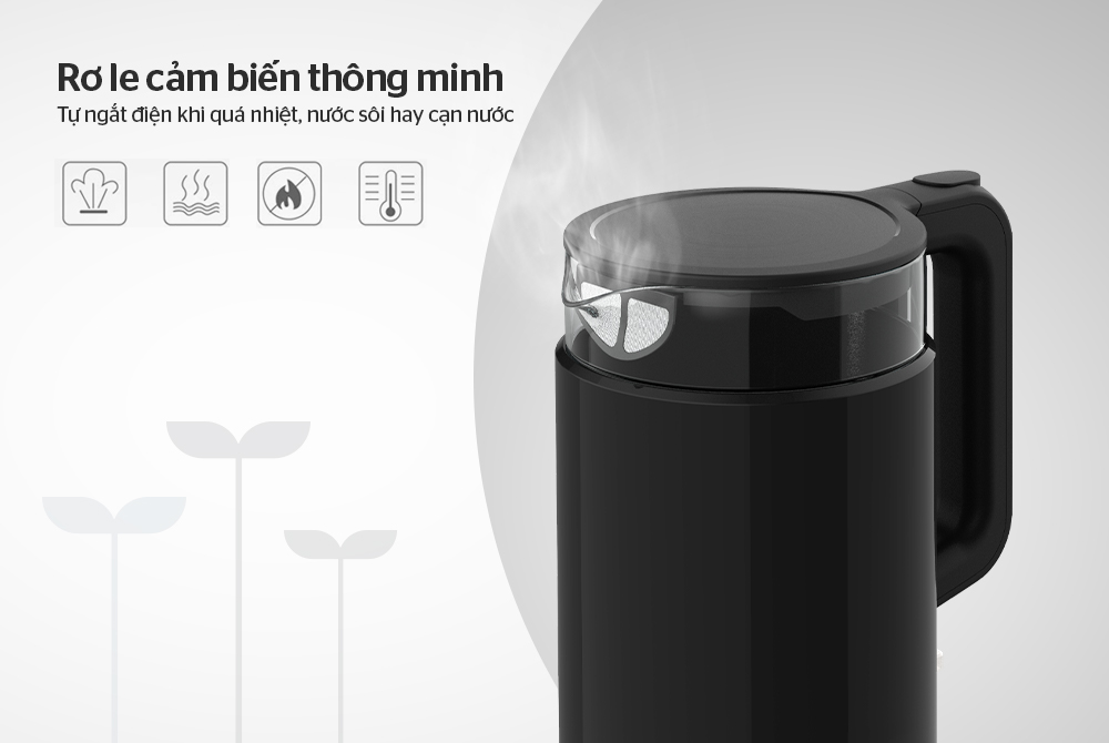 - Chế độ tự động tắt khi nước sôi, cạn nước hoặc quá nhiệt Ấm có chế độ ngắt tự động khi nước sôi hoặc cạn nước, đảm bảo an toàn tối đa cho người sử dụng (quên/bận rộn công việc khác). Chức năng này còn giúp làm tăng tuổi thọ sản phẩm và phòng chống cháy nổ.