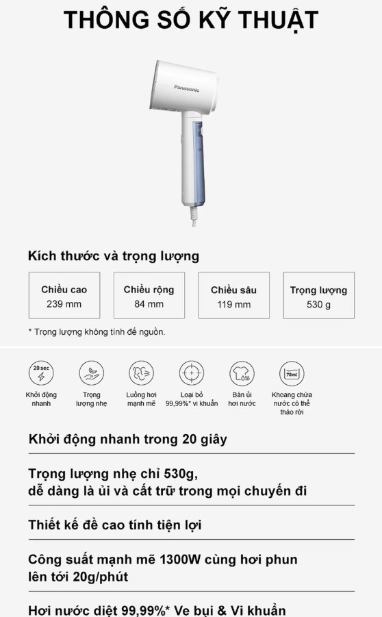 - Trọng lượng nhẹ chỉ 530g, dễ dàng là ủi và cất trữ trong mọi chuyến đi - Trải nghiệm là ủi thật dễ dàng với bàn ủi siêu nhẹ. Trọng lượng chỉ 530g đem lại cho bạn cảm giác nhẹ nhàng khi cầm nắm và di chuyển.