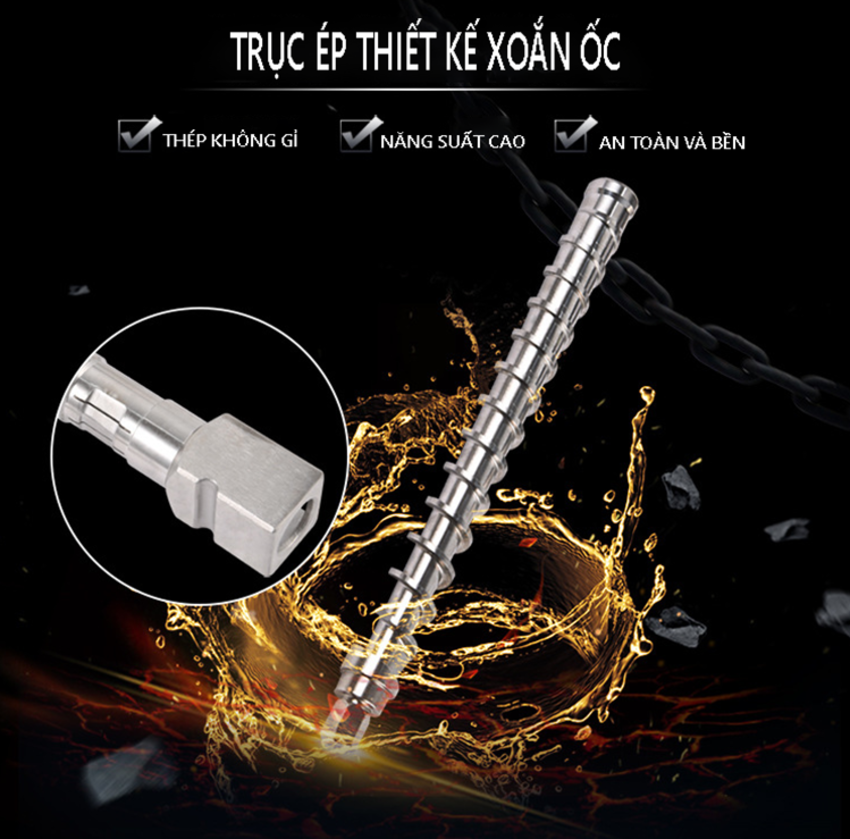 • Mô tơ khỏe hoạt động liên tục, bánh răng truyền lực bằng thép cao cấp chuyên dùng làm nhíp ô tô - Trục ép thiết kế dạng cài, tháo lắp nhanh chóng, trục ép bằng Inox 316 dạng xoắn tháp ép nhanh hơn, kiệt dầu hơn