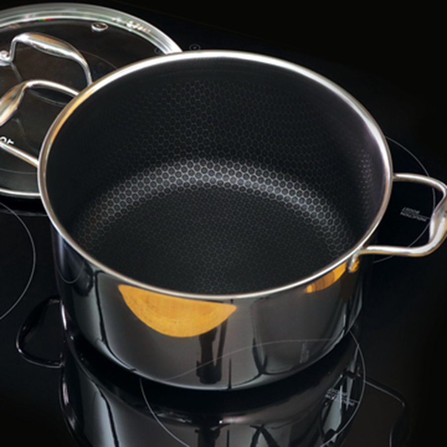 Nồi iMat Hybrid là sự kết hợp giữa chất liệu inox và bề mặt chống dính ứng dụng công nghệ Blackcube, chứa các trụ inox trồi cao giúp dẫn nhiệt tốt đến thực phẩm. Nồi iMat Hybrid cho phép bạn chế biến các món ăn có hương vị thơm ngon hảo hạng, đồng thời có thể thoải mái sử dụng các dụng cụ nấu bằng kim loại không lo trầy xước.