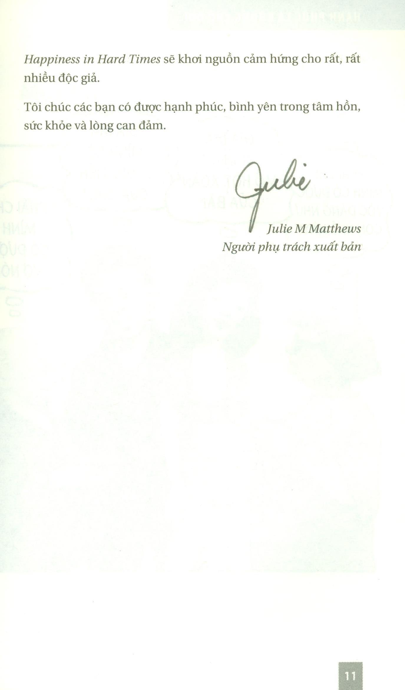 Hạnh phúc là không chờ đợi (Happiness in Hard Times), một sự đúc kết những lập luận và thông điệp mà Andrew Matthews từng gửi đến bạn đọc rất thuyết phục qua các quyển sách ông đã viết. Kết hợp những câu chuyện đời thật của bạn đọc từ khắp thế giới gửi về cho tác giả, những câu chuyện – như nhận xét của một bạn đọc có đăng trong sách này – đưa ra nhiều ví dụ về những giai đoạn cực kỳ khó khăn trong cuộc đời, từ bệnh ung thư, ly dị, bần cùng cho đến bị ngược đãi và tự ngược đãi bản thâ Hạnh phúc là không chờ đợi được xem như công trình nghiên cứu riêng của chính tác giả, nhằm làm sáng tỏ và chứng minh quy luật hấp dẫn hạnh phúc, tiền bạc, niềm bằng cảm xúc tích cực, nhận thức tích cực và kiên định về chính mình trong mỗi con người chúng ta. Đây là thông điệp cốt lõi xuyên suốt tất cả những quyển sách của Andrew Matthews mà Nhà xuất bản Trẻ luôn nỗ lực cung cấp đầy đủ đến tay bạn đọc Việt Nam.
