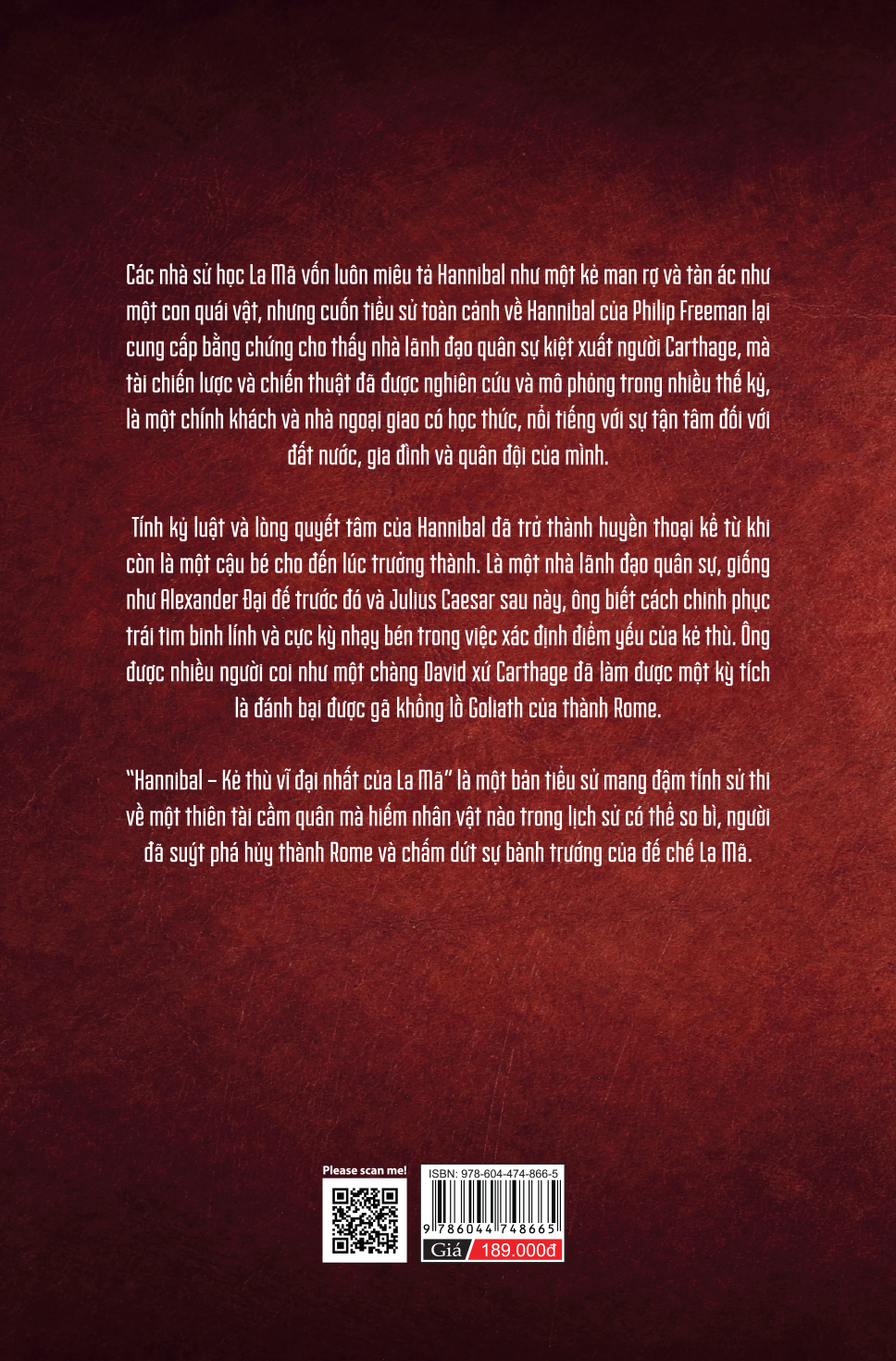 Tên sách:  HANNIBAL: KẺ THÙ VĨ ĐẠI NHẤT CỦA LA MÃThể loại: Lịch sửTác giả:  Philip FreemanDịch giả: Nguyễn Thế  HiềnKhổ sách: 16x 24cmSố trang: 296Hình thức: Bìa cứng áo ômGiá bìa: 189.000 VNĐ...