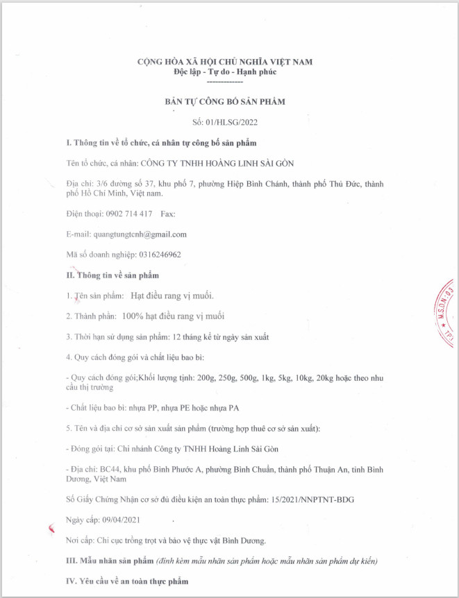 THÔNG TIN SẢN PHẨM HẠT ĐIỀU + Thành phần: hạt điều tự nhiên. + Xuất xứ: Việt Nam. + Trọng lượng: 100G + HSD: 1 năm kể từ ngày sản xuất + Đạt các chứng