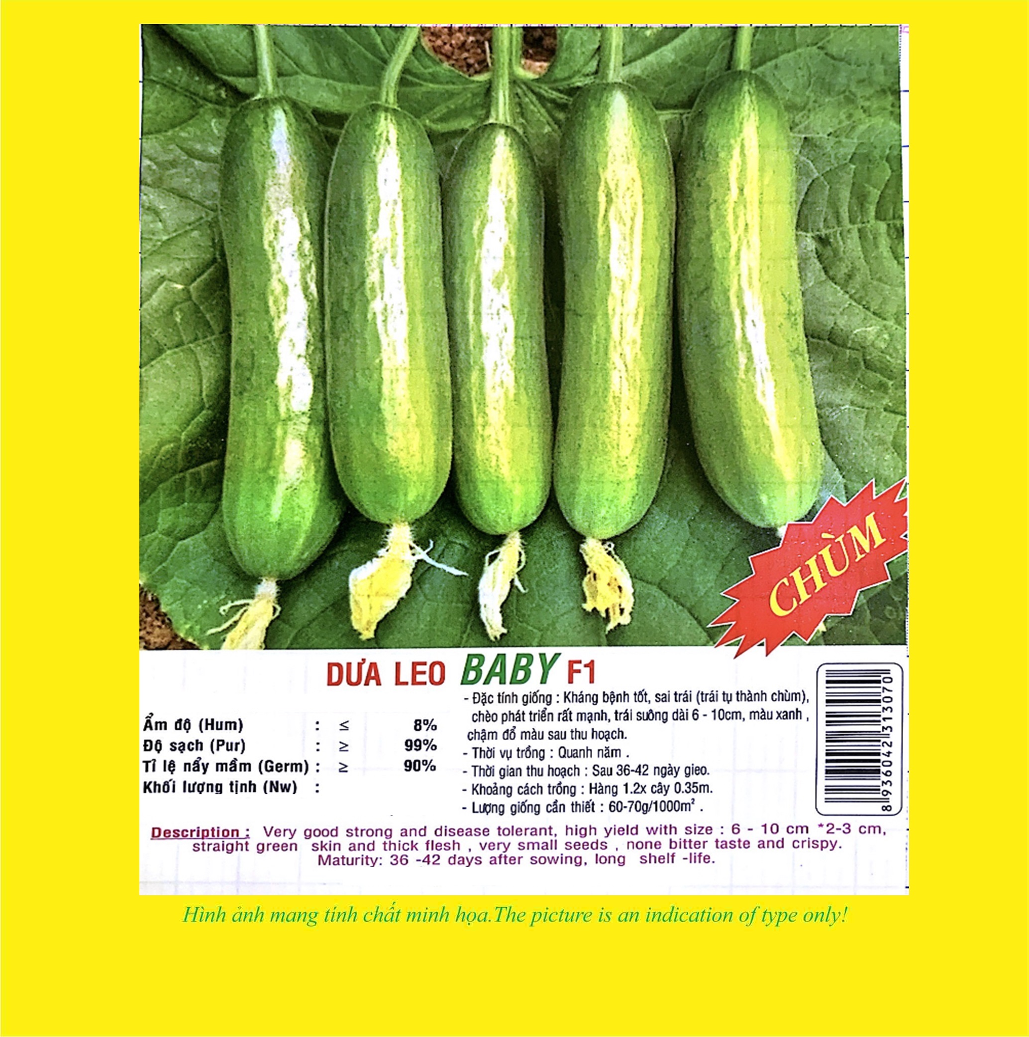 Đặc tính giống: Dưa leo baby F1 - Giống 100% hoa cái, tự thụ phấn, kháng bệnh tốt, trái sai, trái tụ thành chùm, nhánh phát triển mạnh, trái suôn 10-12 cm, màu xanh non ăn giòn ngọt.