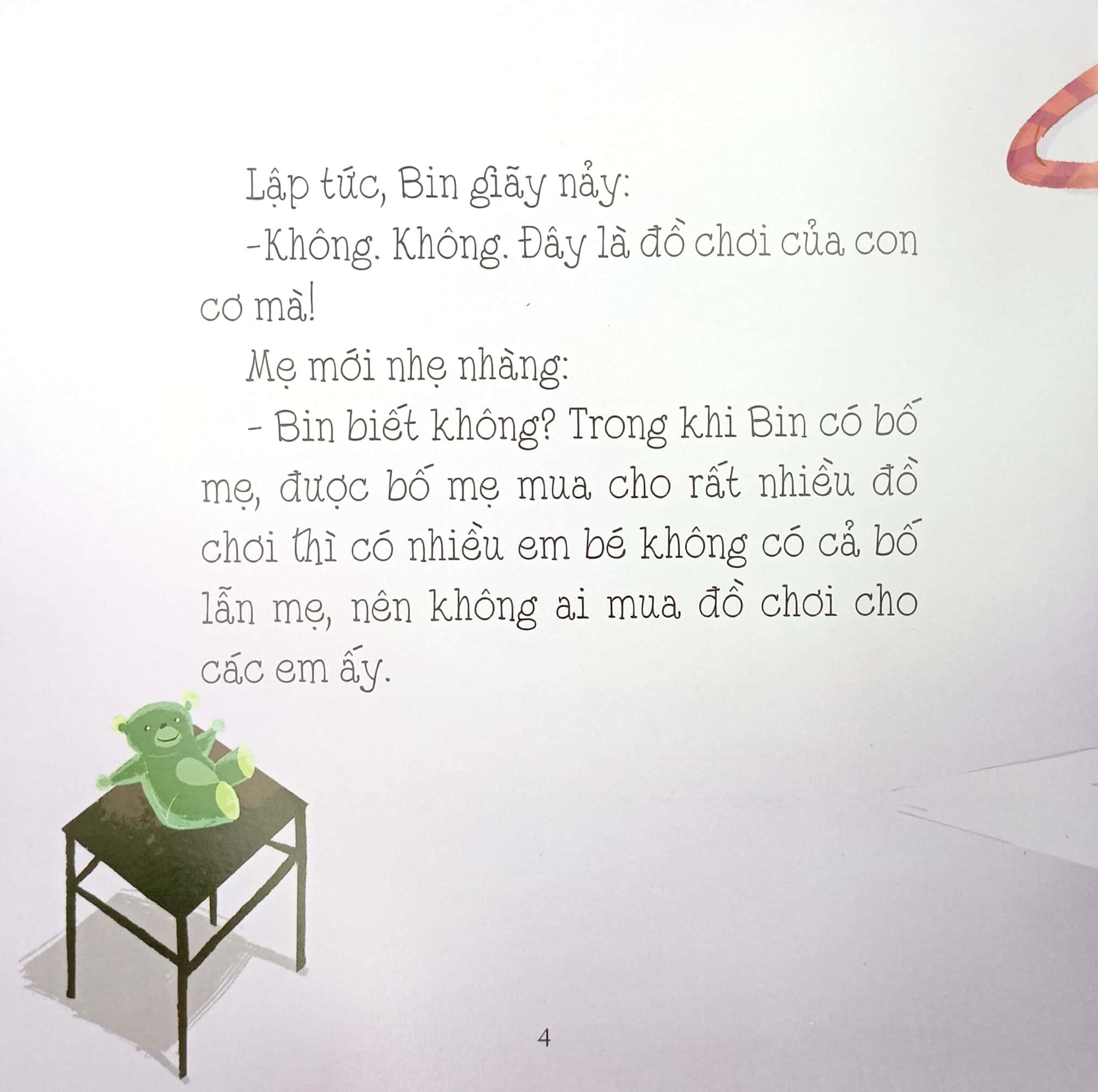Với truyện Bé Nấm đi siêu thị có thể giúp các bé hiểu được việc phải xếp hàng đợi đến lượt m.ình được tính tiền, hay không nên vòi mẹ mua thật nhiều quà, bánh… Còn truyện Tránh xa người lạ lại giúp các bé hiểu được việc không nên tiếp xúc với người lạ, hoặc không để người lạ vuốt ve, hay không nên đi một m.ình đến nơi công cộng hay chỗ vắng người mà phải có người lớn đi cùng. Hoặc bé cần biết khi nào m.ình nên cảm ơn hoặc xin lỗi thông qua câu chuyện Xin lỗi và Cảm ơn. Và cám ơn hay xin lỗi cũng không phải đặc quyền của riêng trẻ nhỏ, mà ngay cả người lớn, bậc phụ huynh cũng nên cám ơn và xin lỗi con khi cần thiết.