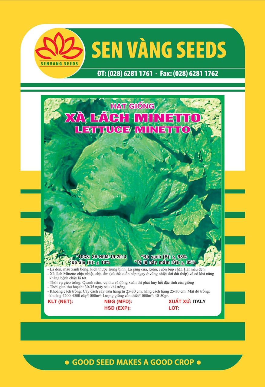 - Đặc tính giống: Giống sinh trưởng phát triển khỏe, cây to, lá xanh mỡ bóng, và có khả năng cuốn búp chắc, kháng sâu bệnh tốt, năng suất cao, đặc biệt ăn rất ngon Kỹ thuật trồng xà lách Minetto: Xà lách Minetto là loại rau xà lách có xuất xứ từ đất nước Italia. Lá xà lách có độ giòn, xanh bóng, răng cưa, xoăn, cuốn búp chặt. Hạt màu đen có thể dùng làm giống cho mùa sau. Đây là loại rau có khả năng chịu nhiệt, chịu ẩm (có thể cuốn bắp ngay ở vùng nhiệt đới đất thấp) và có khả năng kháng bệnh cháy lá tốt. Xà lách thường được dùng ăn sống, trộn salad cùng nhiều loại rau củ khác.