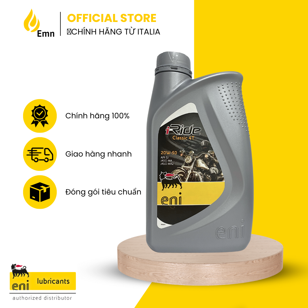 Eni I-Ride Classic 4T 20W50 là dầu nhớt gốc khoáng chất lượng cao được thiết kế để phù hợp cho các động cơ xe máy 4 thì truyền thống, các dòng xe đời cũ, ma sát ly hợp cao.   TÍNH CHẤT • Cấp nhớt: JASO MA, MA2- API SJ • Chỉ số độ nhớt: 131 • Dung tích: 1L   ĐẶC TÍNH • Giúp các vòng và pít-tông hoạt động đúng cách và dễ dàng len lỏi vào các kẽ hở trong hệ thống động cơ, dễ dàng đẩy các lớp bụi, cặn bám trong động cơ và lấp đầy các rỗ bánh răng một cách hiệu quả. • Với công nghệ phân tán và tẩy rửa, sản phẩm có khả năng kiểm soát cặn bám vượt trội để sử dụng trong môi trường ô nhiễm và trong điều kiện vận hành khắc nghiệt. • Ngăn chặn cặn bẩn bám dính, giúp giữ động cơ sạch sẽ và vận hành êm ái hơn.   ỨNG DỤNG • Sử dụng được cho xe số và tay ga, động cơ xe máy 4 thì truyền thống, các dòng xe đời cũ. • Khuyến nghị thay nhớt sau 1,500km hoặc sau 1 năm vận hành tuỳ điều kiện nào đến trước