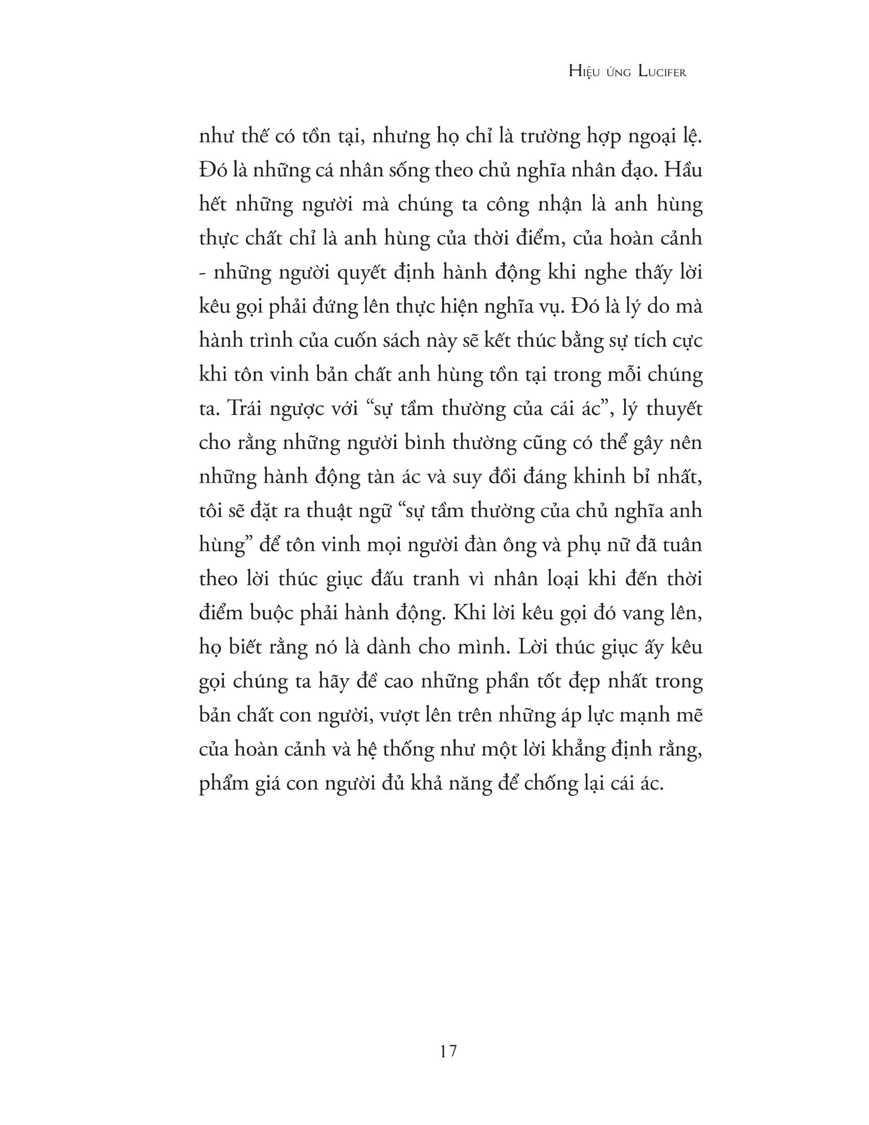 Cuốn sách khiến chúng ta phải có cái nhìn khác về bản chất của con người, rằng ranh giới thiện - ác không hề bất khả x.âm phạm và mỗi cá nhân đều có thể dễ dàng sa ngã và bị cuốn theo sự tàn độc. Nhưng bằng cách hiểu được những yếu tố tâm lý chi phối tâm trí và hành vi trong những bối cảnh cụ thể, con người hoàn toàn có khả năng rèn luyện để giữ m.ình trước những cám dỗ của cái ác và sự phi nghĩa, thậm chí có thể dũng cảm đứng lên đấu tranh, thực hiện những hành động anh hùng vì những giá trị nhân đạo vĩnh cửu.