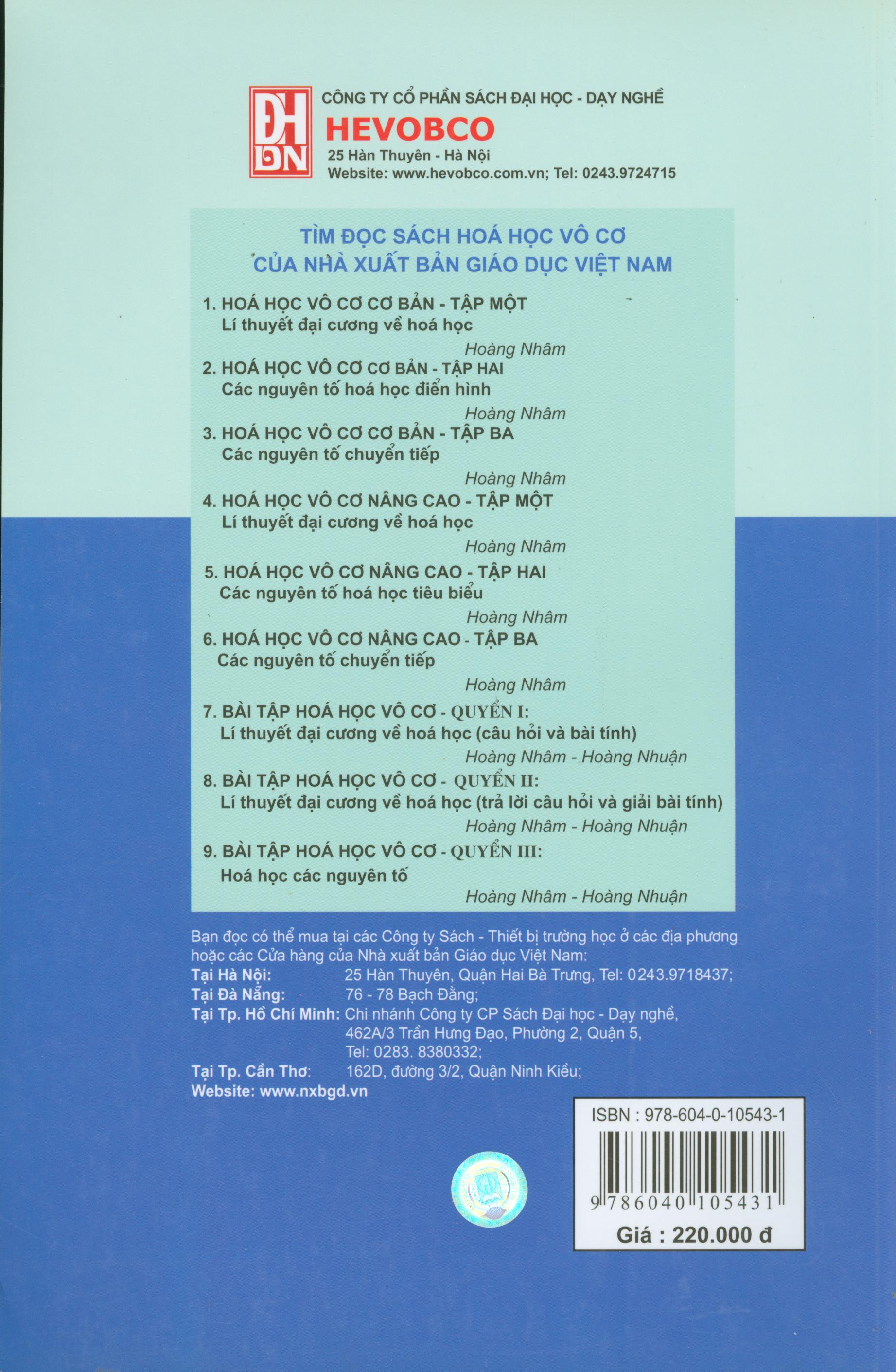 Giáo trình Hoá học Vô cơ này đã được viết và giảng dạy từ những năm 50 của thế kỷ trước cho sinh viên khoa Hoá học trường Đại học Tổng hợp Hà Nội trước đây và nay là Trường Đại học Khoa học Tự nhiên, thuộc Đại học Quốc gia Hà Nội. Mới đầu, giáo trình được in ronêo để cho sinh viên trong trường học tập. Đến năm 1975, hai cuốn Hoá học Vô cơ tập một và tập hai được in tipo do Nhà xuất bản Đại học và Trung học Chuyên nghiệp phát hành. Bản thảo sách của lần xuất bản đầu tiên này được Giáo sư Hoàng Ngọc Cang ở trường Đại học Sư phạm Hà Nội đọc và góp ý kiến. Để tỏ lòng biết ơn thầy giáo, tôi đã xin phép thầy giáo ghi tên thầy là đồng tác giả của sách (Hoàng Ngọc Cang, Hoàng Nhâm). Sách đã được dùng chủ yếu cho sinh viên khoa Hóa học trường Đại học Tổng hợp Hà Nội và trường Đại học Sư phạm Hà Nội. Gần hai mươi năm sau, khi có thêm nhiều trường cao đẳng và đại học được thành lập và nhu cầu học tập tăng cao, Nhà xuất bản Giáo dục Việt Nam tái bản hai cuốn Hoá học Vô cơ tập một và tập hai. Vào thời gian này, Giáo sư Hoàng Ngọc Cang đã chuyển về ở thành phố Hồ Chí Minh, không có điều kiện đọc và góp ý kiến cho bản thảo mới đã sửa và bổ sung nhiều cho lần xuất bản này, thầy đề nghị rút tên thầy là đồng tác giả của sách và mặt khác thầy luôn nhắc nhở tôi dành nhiều thời gian hoàn thành cuốn Hóa học Vô cơ tập ba để giáo trình được trọn bộ. Năm 2000, cuốn sách tập ba đó mới được xuất bản. Nhận được sách tôi kính biếu, thầy rất mừng và viết thư ngay khen ngợi tôi đã có nhiều cố gắng hoàn thành nhiệm vụ. Từ đó đến nay, ba tập sách đã được tái bản hàng năm. Trước đây, giáo trình Hoá học Vô cơ được xây dựng trên tinh thần tinh giản chương trình môn học của Bộ Đại học và Trung học Chuyên nghiệp để phù hợp với thời chiến. Ngày nay nhiều trường đại học mới đã được mở thêm, và nhu cầu học tập của học sinh và sinh viên cũng như nhu cầu tham khảo của thầy, cô giáo ngày càng tăng cao. Mặt khác, do sự phát triển rất mạnh của ngành học trong mấy chục năm qua, nhiều kiến thức khoa học hiện đại thuộc những lĩnh vực khác như vật lý, hoá - ỉý, hoá học hữu cơ, sinh vật học và công nghệ cao được thu hút vào Hoá học Vô cơ làm cho giáo trình này vốn đã rất phong phú nay trở thành phong phú vượt bậc. Trước tình hình đó, học tập kinh nghiệm của một số nước tiên tiến trên thế giói về khoa học và giáo dục, tôi viết bổ sung thêm vào bộ sách Hóa học Vô cơ nhiều kiến thức hiện đại về hoá học lý thuyết cần thiết cho môn học và nhiều kiến thức hiện đại về hoá học ứng dụng nhằm xây dựng một hành trang khá vững chắc và toàn diện về Hoá học Vô cơ cho học sinh các trường năng khiếu, sinh viên các trường cao đẳng và đại học, nghiên cứu sinh, thầy giáo trẻ và nhà nghiên cứu trẻ quan tâm nhiều đến hoá học. Bởi vậy sách tham khảo này được gọi là Hóa học Vô cơ nâng cao. Tập một của bộ sách trình bày lý thuyết đại cương về hoá học ; tập hai trình bày hoá học các nguyên tố tiêu biểu và tập ba trình bày hoá học các kim loại chuyển tiếp. Ngoài ba tập giáo trình Hoá học Vô cơ nâng cao này còn có ba quyển Bài tập Hoá học Vô cơ, được biên soạn rất sát với nội dung lý thuyết của giáo trình. Sau khi tự nghiên cứu kỹ lý thuyết, sinh viên trả lời hết số câu hỏi và giải xong một nửa số bài tính trong cuốn bài tập, có thể được coi là hoàn thành tốt việc học tập Hóa học Vô cơ hiện đại.