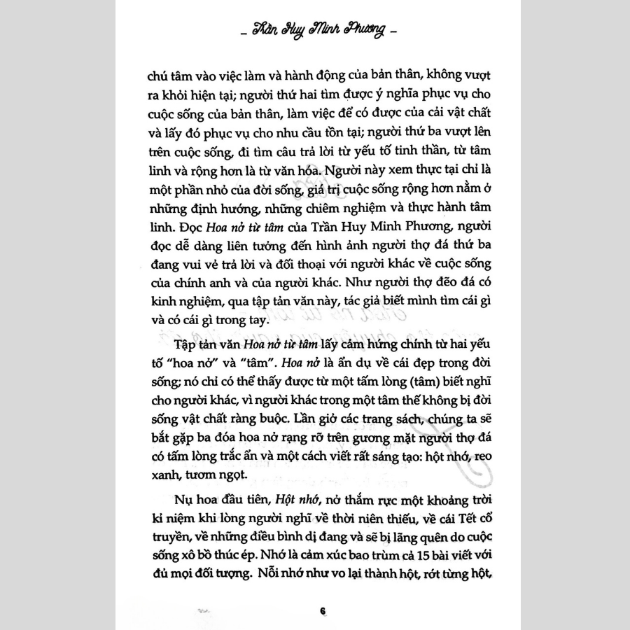 Tập tản văn Hoa nở từ tâm lấy cảm hứng chính từ hai yếu tố “hoa nở” và “tâm”. Hoa nở là ẩn dụ về cái đẹp trong đời sống; nó chỉ có thể thấy được từ một tấm lòng (tâm) biết nghĩ cho người khác, vì người khác trong một tâm thế không bị đời sống vật chất ràng buộc. Lần giở các trang sách, chúng ta sẽ bắt gặp ba đóa hoa nở rạng rỡ trên gương mặt người thợ đá có tấm lòng trắc ẩn và một cách viết rất sáng tạo: hột nhớ, reo xanh, tươm ngọt.