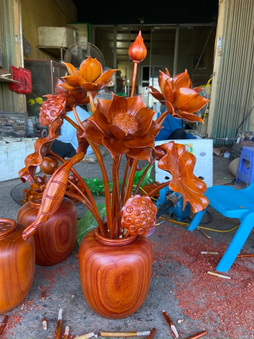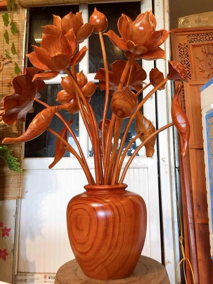 _ Bình hoa sen bằng gỗ hương được tiện khắc ,phân cành lá ,hoa,gương , rất tỉ mỉ tinh sảo kỳ công ,Đi hầu hết tất cả mọi chi tiết góc ngách nội dung hoa văn của bình hoa ,Đều được ngọt tỉa ,chỉnh sửa hoàn toàn bằng tay thủ công .Đồng thời hoa sen gỗ hương và bình được kiểm định rất kỹ lưỡng như cho vào thẩm sấy cho gỗ kiệt .Mục đích trống dập nứt vênh mo mối mọt .Kết hợp với trà nhám ,đánh giấy giáp nhiều nước cho sạch sẽ ,sờ mát lạnh ,Rồi cho vào phun lót làm bóng mờ để giữ lại mầu sắc vân gỗ tự nhiên .Bình hoa sen được làm và hoàn thiện do bàn tay khối óc tài hoa ,Từ những người thợ giàu kinh nghiệm ,Cũng như tay nghề cao trong làng nghề truyền thống .Chính vì thế bình hoa ,bằng gỗ hương đã đáp ứng đầy đủ những tiêu trí ( Đẹp bền rẻ ) Thẩm mỹ nghệ thuật với chất lượng tuyệt vời