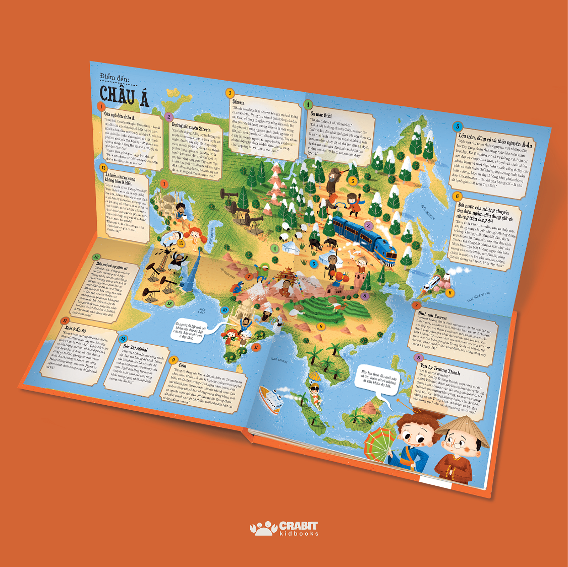 Với những cô nhóc cậu nhóc hay tò mò, muốn khám phá thế giới bao la ngoài kia thì bộ sách “Hỏa xa phiêu lưu ký” đích thực là một kho báu! Bộ sách sẽ mời trẻ bước lên chuyến tàu hỏa độc nhất vô nhị, đưa trẻ chu du vòng quanh thế giới và mỗi lần dừng chân là trẻ đang ở một lục địa mới. Tại mỗi trạm dừng, trẻ sẽ được “cấp cho” một chiếc bản đồ lật mở khổng lồ, đóng vai trò như một “hướng dẫn viên du lịch” giúp trẻ tìm tòi và khám phá những điều vô cùng hay ho ở châu lục đó. Chẳng hạn khi đặt chân đến châu Âu, trẻ sẽ biết được Phần Lan là “đất nước có nhà tắm hơi còn nhiều hơn cả ô tô”, biết được cây cầu dài nhất thế giới nối liền hai quốc gia là Đan Mạch và Thủy Điển, biết được thiên nga trắng là một trong những loài chim nặng nhất thế giới (có em nặng đến 12 kg lận đó). Các thông tin về địa lý, văn hóa, món ăn truyền thống, động vật đặc hữ ở từng châu lục được chọn để giới thiệu với trẻ đều là những thông tin mới mẻ, thú vị, đảm bảo đưa trẻ đi từ bất ngờ này đến bất ngờ khác và không thể dừng chuyến hành trình tàu hỏa đặc biệt này được một khi đã bước chân lên tàu!