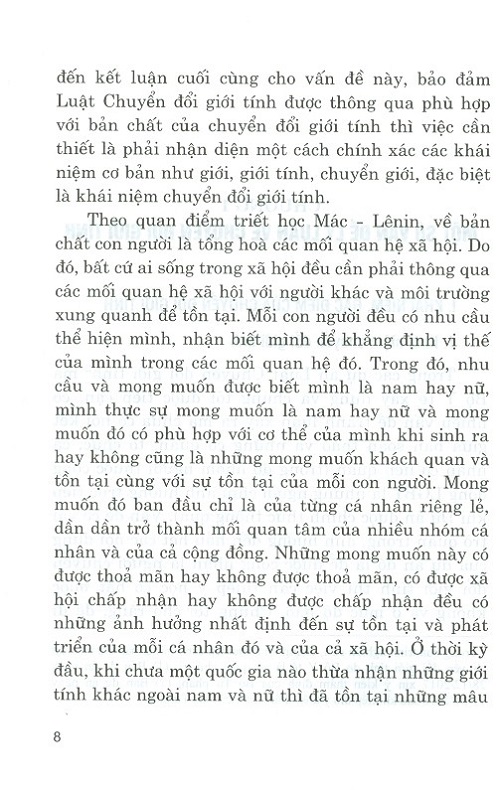 Cuốn sách nghiên cứu, đánh giá các quan điểm khác nhau về khái niệm “chuyển đổi giới tính”, đưa ra hướng hoàn thiện khái niệm này, đồng thời chỉ ra một số đặc điểm, xác định bản chất của chuyển đổi giới tính, khẳng định chuyển đổi giới tính là nhu cầu khách quan của con người và là một trong các quyền nhân thân của cá nhân được ghi nhận trong Bộ luật Dân sự năm 2015