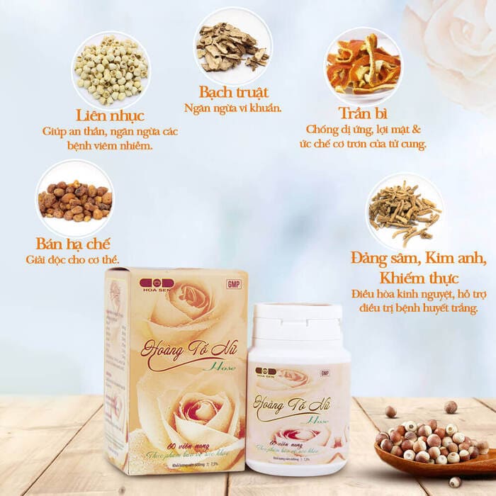 - THÀNH PHẦN VIÊN UỐNG HỖ TRỢ HUYẾT TRẮNG HOÀNG TỐ NỮ DÂN KHANG Mỗi viên Hoàng tố nữ chứa 153mg cao tương đương dược liệu khô: Bạch truật ………………………………….. 210mg Đảng sâm …………………………………… 270mg Bán hạ chế ………………………………….. 120mg Trần bì ………………………………………. 120mg Khiếm thực ……………………………….…. 270mg Liên nhục …………………………………….. 270mg Kim anh ……………………………………… 270mg Thành phần khác (tinh bột, lactose, calci carbonat, talc, magnesium stearate) vừa đủ. 2 CÔNG DỤNG VIÊN UỐNG HỖ TRỢ PHỤ KHOA HOÀNG TỐ NỮ DÂN KHANG