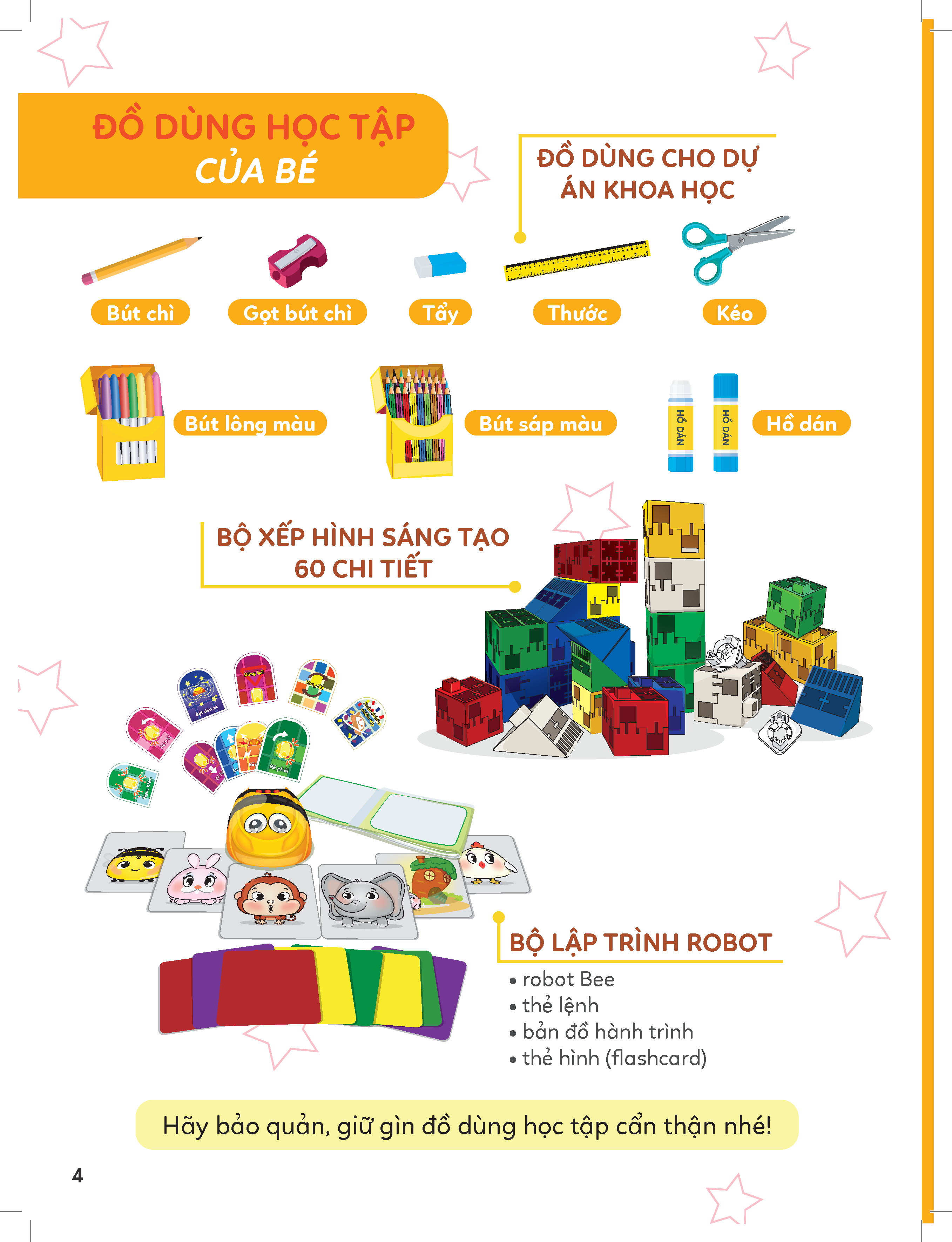 Nội dung tài liệu gồm ba phần chính: Dự án Khoa học, Xếp hình Sáng tạo, và Lập trình robot. Mỗi phần đều được thiết kế dựa trên các tình huống và vấn đề thực tiễn, nhằm khuyến khích trẻ quan sát, đặt câu hỏi, khám phá, từ đó phát triển tư duy logic, sáng tạo, và chủ động giải quyết vấn đề.