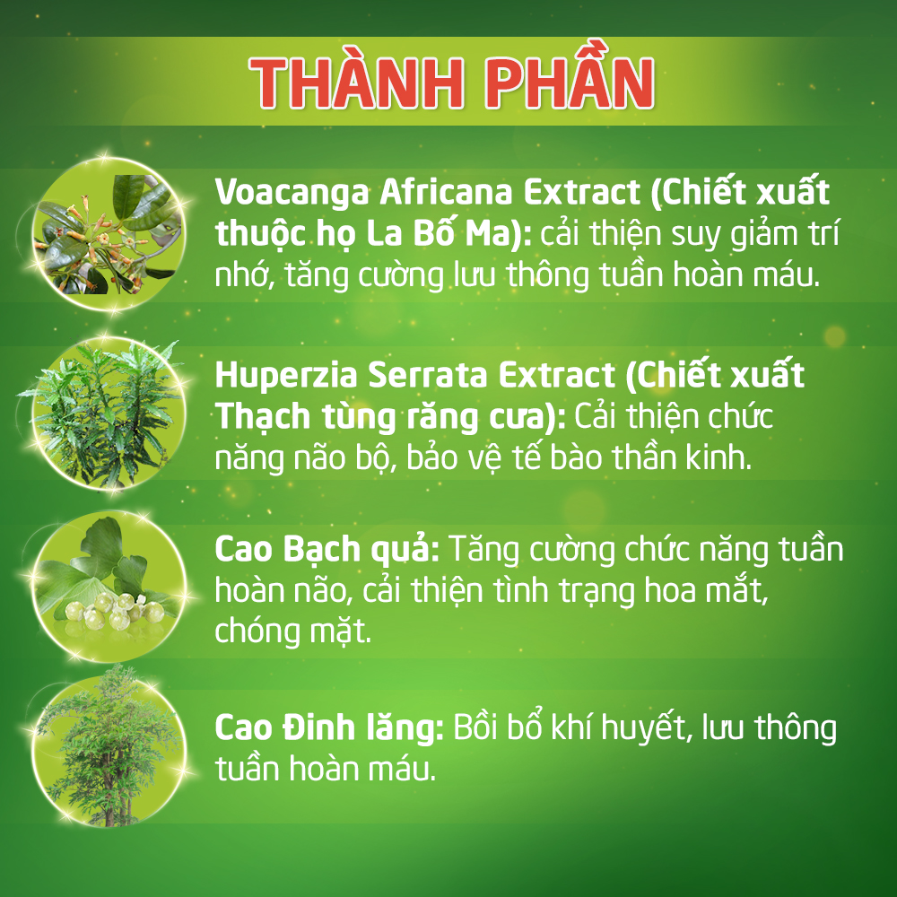 - Thành phần sản phẩm Trong mỗi viên có chứa: Cao bạch quả (Ginkgo biloba extract) 120mgGABA 50mg Cao đinh lăng 50mg Magie citrat 20mg Rutin 10mg Citicoline 5mg Voacanga Africana extract 5mg Coenzyme Q10 2mg Vitamin B6 2mg Melatonin 2mg Huperzia Serrate extract 400mcg (Chiết xuất thạch tùng răng cưa) Nattokinase 300FU Phụ liệu: Tinh bột, talc, magnesium stearate, gelatin, nipazil, nipazol vừa đủ 1 viên.
