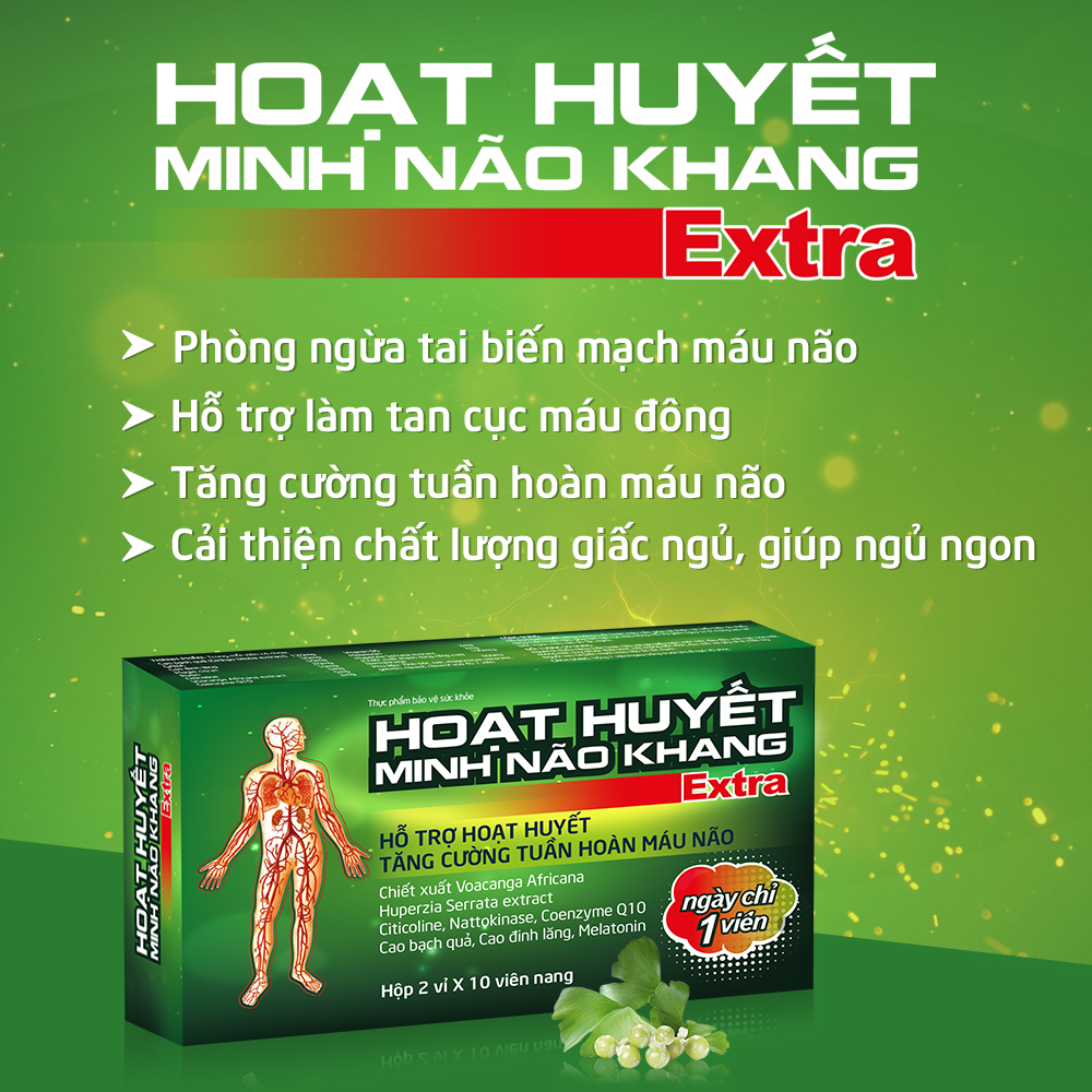 HOẠT HUYẾT MINH NÃO KHANG EXTRA HỘP 3 VỈ X 10 VIÊN Hoạt Huyết Minh Não Khang được bào chế từ các dược liệu thuộc nhóm bổ huyết có tác dụng tuần hoàn máu tới các bộ phận của cơ thể, giúp an thần, tạo giấc ngủ sinh lý sâu.