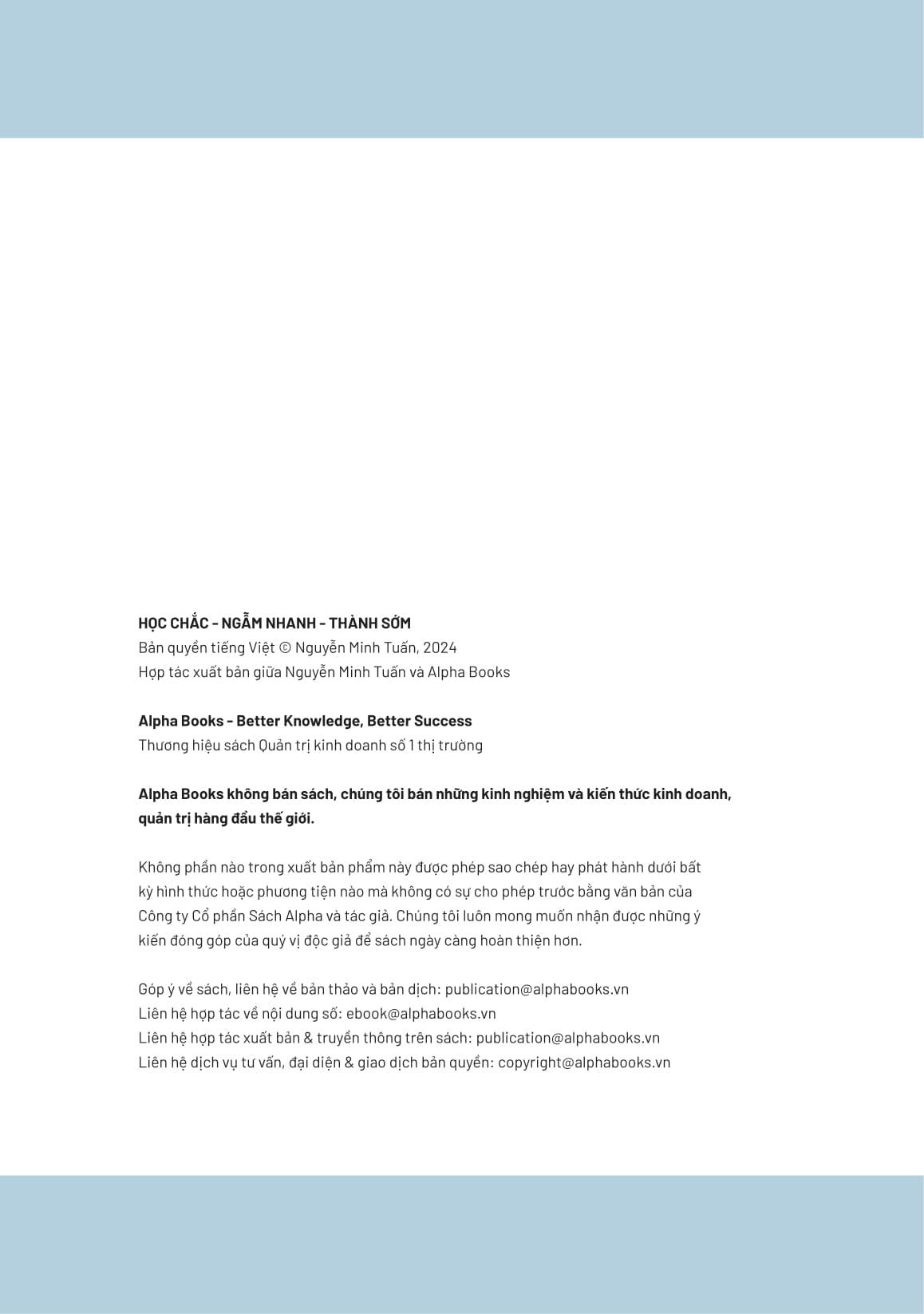 Cuốn sách "Học Chắc - Ngẫm Nhanh - Thành Sớm" là sự chia sẻ về hành trình phát triển sự nghiệp và bản thân của tác giả Nguyễn Minh Tuấn. Với cấu trúc 8 chương, tác giả truyền tải các bài học quý giá về việc học hỏi, suy ngẫm, và đạt được thành công sớm. Qua những trải nghiệm cá nhân, tác giả nhấn mạnh tầm quan trọng của việc học chắc – xây dựng nền tảng vững chắc, ngẫm nhanh – rút ra bài học từ thực tiễn, và từ đó đạt được thành công một cách chủ động. Nội dung không chỉ giới hạn ở lý thuyết mà còn đậm tính thực hành, giúp người đọc ứng dụng ngay vào công việc và cuộc sống, hướng tới phát triển bản thân và xây dựng sự nghiệp bền vững.