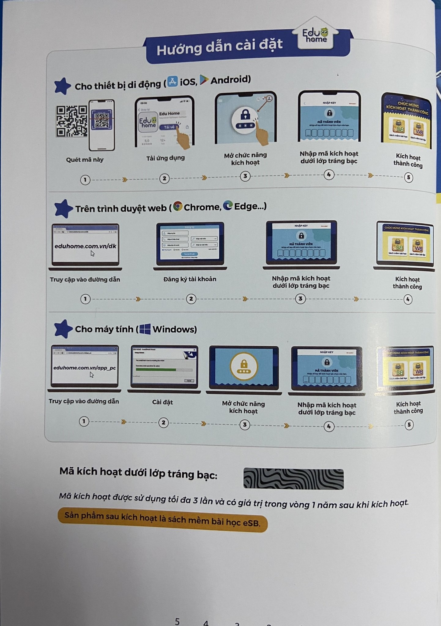Dùng mã code dưới lớp tráng bạc bìa 2 để kích hoạt sách mềm tại trang E