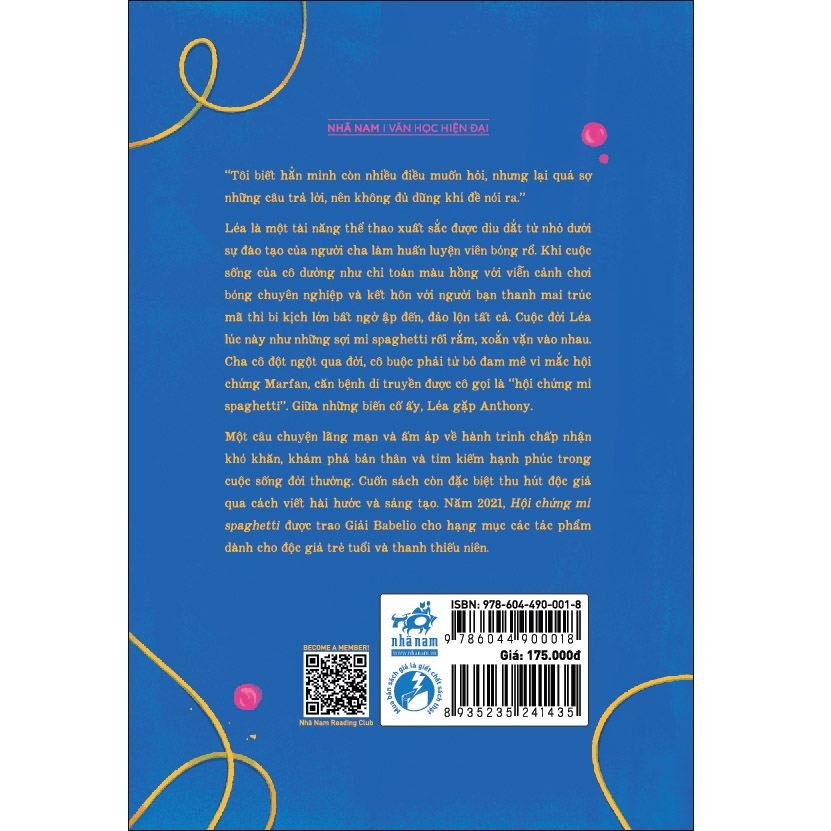 Léa là một tài năng thể thao xuất sắc được dìu dắt từ nhỏ dưới sự đào tạo của người cha làm huấn luyện viên bóng rổ. Khi cuộc sống của cô dường như chỉ toàn màu hồng với viễn cảnh chơi bóng chuyên nghiệp và kết hôn với người bạn thanh mai trúc mã thì bi kịch lớn bất ngờ ập đến và khiến nó đảo lộn hoàn toàn. Cuộc đời Léa lúc này như những sợi mì spaghetti rối rắm, xoắn vặn vào nhau. Cha cô đột ngột qua đời và cô buộc phải từ bỏ đam mê vì mắc hội chứng Marfan, căn bệnh di truyền được cô gọi là “hội chứng mì spaghetti”. Giữa những biến cố ấy, Léa gặp Anthony, một chàng trai cũng mang trong mình tài năng và đam mê bóng rổ giúp Léa vượt lên nghịch cảnh. Không đơn thuần là một câu chuyện lãng mạn, “Hội chứng mì spaghetti” còn mang tính nhân văn với những thông điệp về sự chấp nhận khó khăn, khám phá bản thân và tìm kiếm hạnh phúc trong cuộc sống đời thường. Cuốn sách thu hút độc giả qua cách viết hài hước và sáng tạo. Năm 2021, “Hội chứng mì spaghetti” được trao Giải Babelio cho hạng mục các tác phẩm dành cho độc giả trẻ tuổi và thanh thiếu niên.