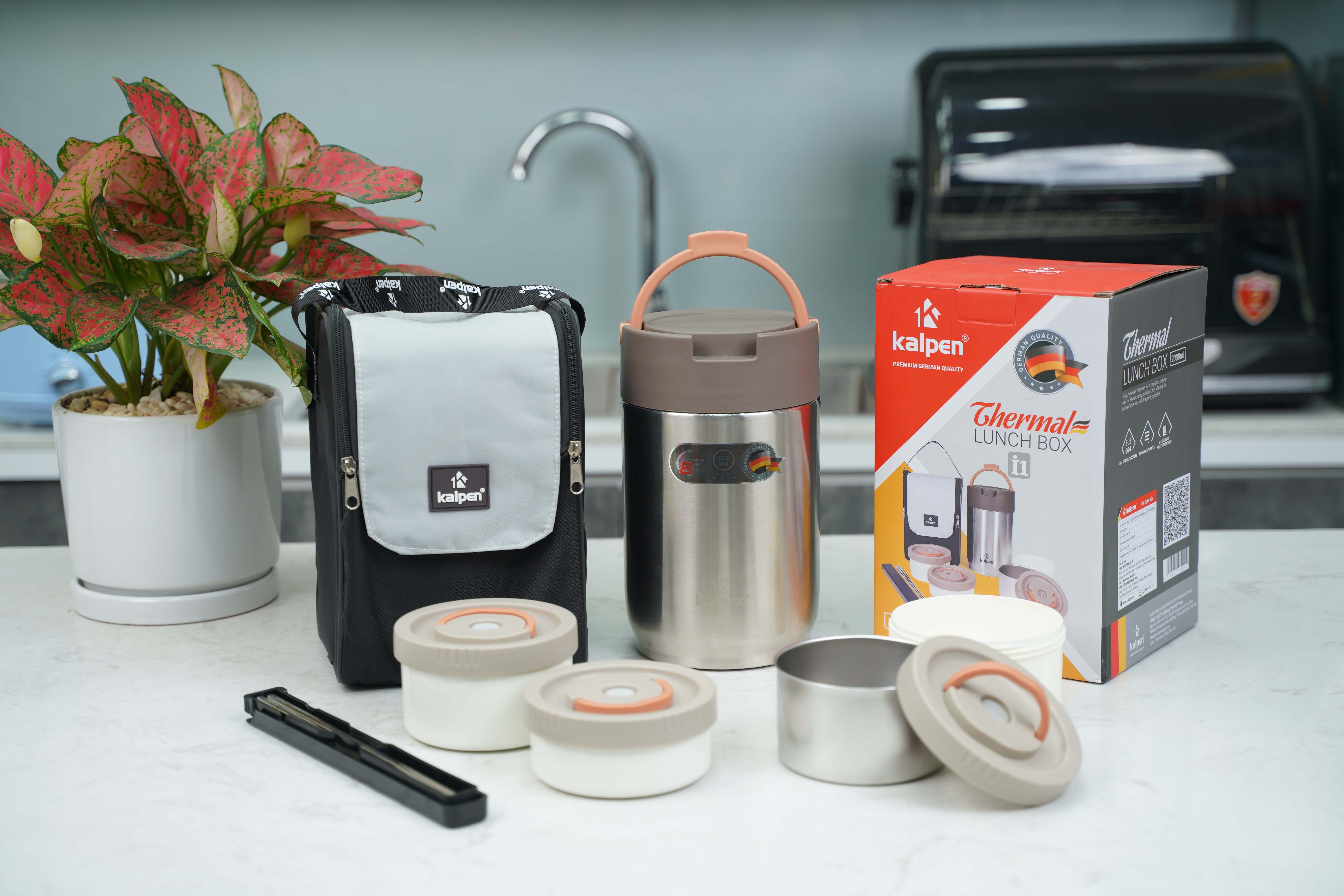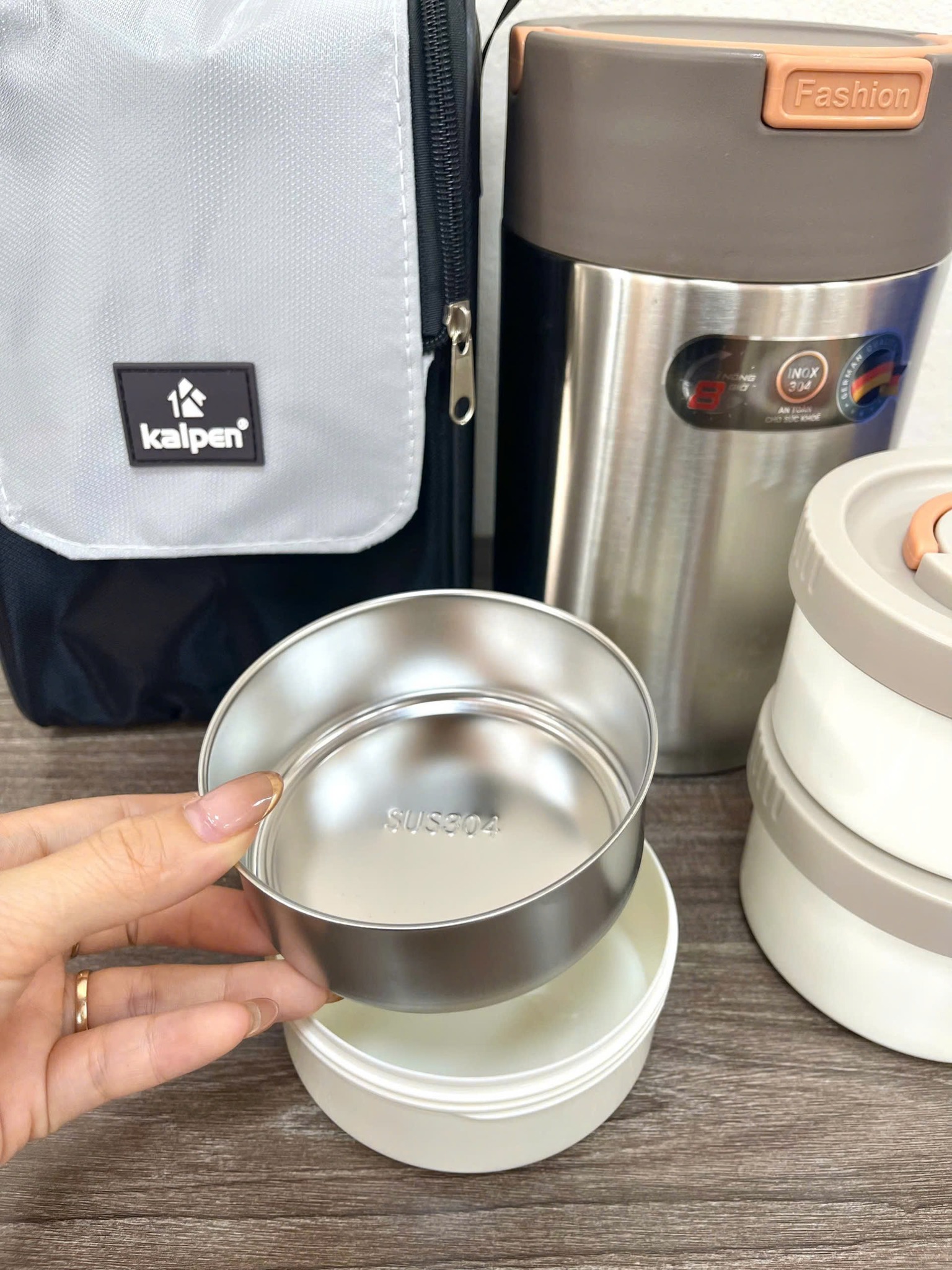 - Hộp cơm giữ nhiệt 3 ngăn Kalpen I1 màu sắc trang nhã, hiện đại. Thiết kế tiện ích với 3 ngăn đựng tách biệt gồm 1 hộp nhỏ 260ml và 2 hộp lớn hơn dung tích 420ml để đựng cơm, canh và đồ ăn. Không chỉ phù hợp để mang cơm đi làm mà còn có thể sử dụng để đựng chè, cháo, đồ ăn dặm cho bé khi đi cắm trại, picnic, dã ngoại…