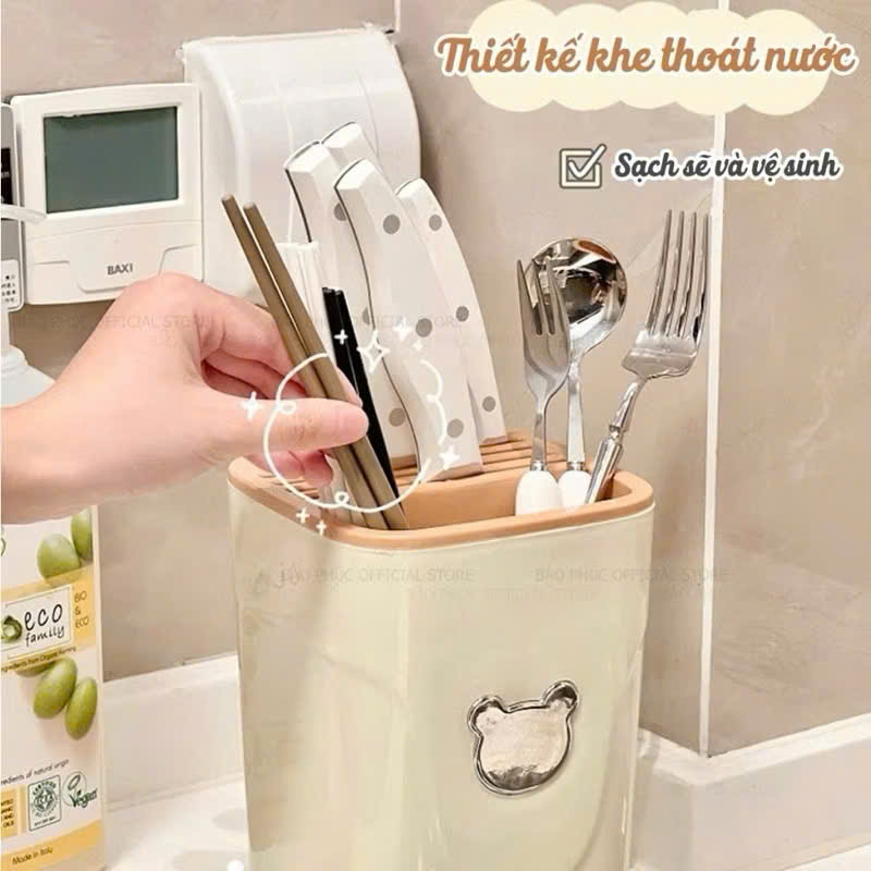 Thiết kế đa năng: Hộp đựng dao, kéo, đũa được thiết kế với nhiều ngăn, giúp bạn dễ dàng phân loại và lưu trữ các dụng cụ nhà bếp một cách gọn gàng và tiện lợi. Không chỉ đựng dao kéo, sản phẩm còn có thể sử dụng để đựng đũa, thìa, dĩa, và các vật dụng nhỏ khác trong bếp.