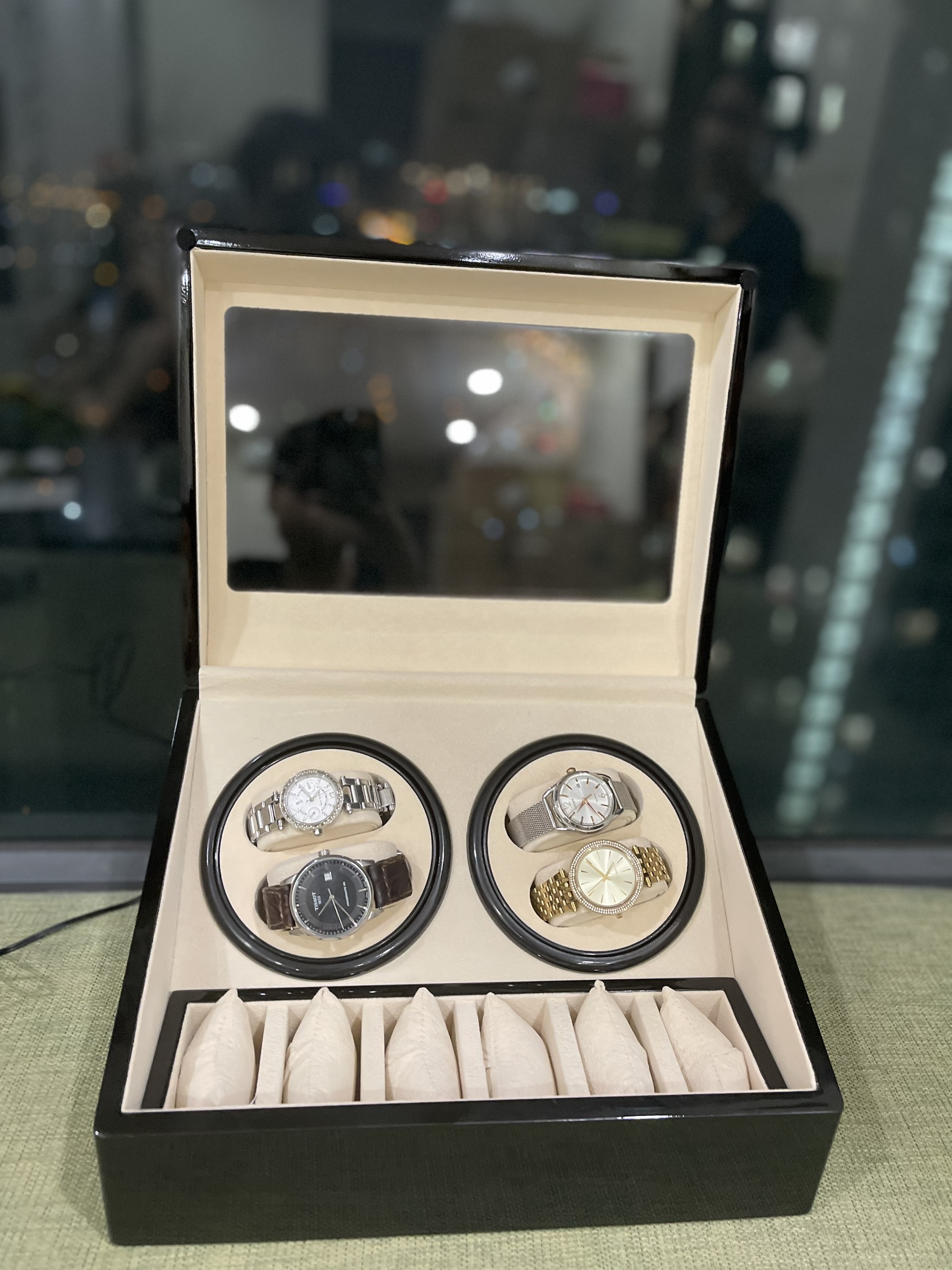 Hộp Đựng Đồng Hồ Cơ 4 Xoay 6 Trưng Bày Gỗ Đen Lót Đen