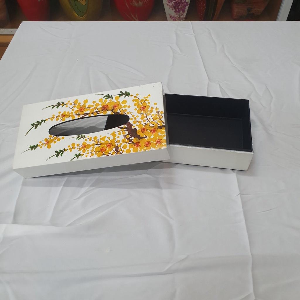 Công dụng: Hộp đựng khăn giấy được thiết kế tinh sảo, nhỏ gọn từ ngoài vào trong, bên ngoài được vẽ hoa mai vàng, bên trong dùng để đựng khăn giấy, tạo sự sang trọng cuốn hút, mới lạ đối với người nhìn