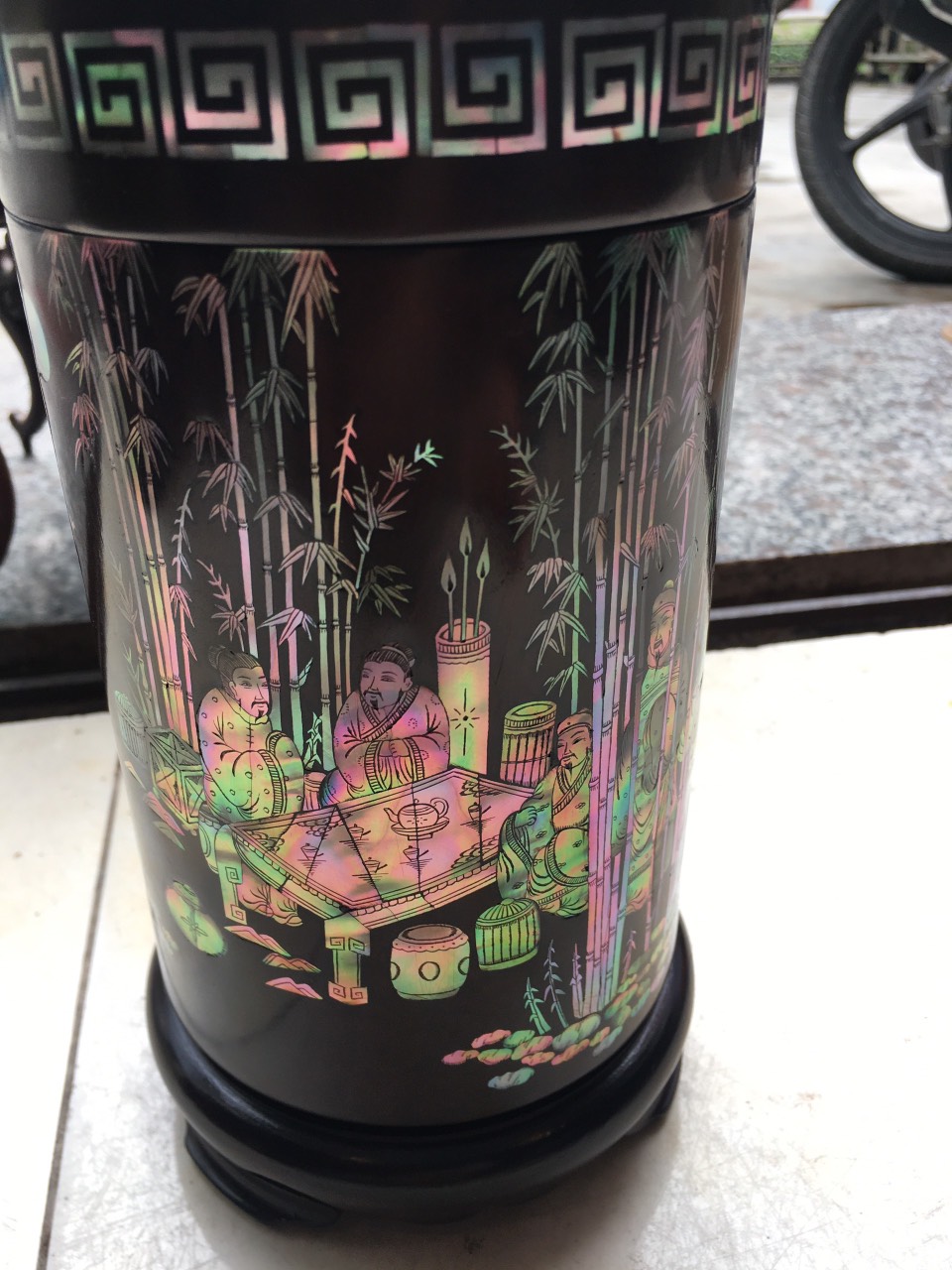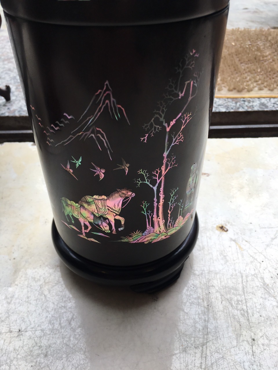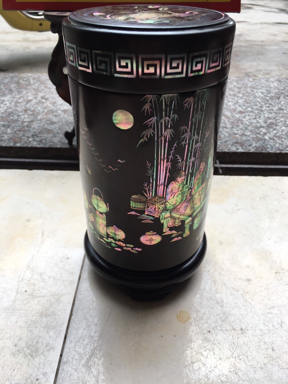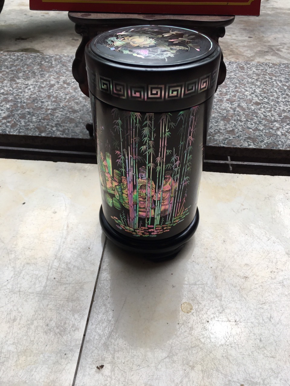 _ Hộ đựng trà được tiên khắc kết hợp với khảm ốc đỏ ,rất tỉ mỉ tinh sảo kỳ công ,Ốc đỏ là một loại ốc quý hiếm ,thường xuyên sinh sống ở những nước xa sôi như singgapo và nhật bản ,như ở việt nam biển rất nhiều lên không có ốc ,nếu có thì có rất ít lại không mầu ,Chính vì thế ốc thường được nhập khẩu từ singgapore về rất đắt đỏ ,những bù lại mầu sắc rất đỏ và đẹp ,và được rất nhiều người ưa chuộng cũng như muốn sử hữu 1 sẩn phẩm khảm ốc đỏ như khảm sập gụ tủ chè tranh ảnh ,đặt biệt khảm vào hộp đựng trà ,kết hợp với chất liệu thân gỗ trắc đỏ đen . Đã nâng tầm hộp trà chè với sự sang trọng được đánh giá cao .Hộp đựng trà chè được làm và hoàn thiện do bàn tay khối óc tài hoa từ những người thợ dầy rặn kinh nghiệm ,Cũng như tay nghề cao trong làng nghề truyền thống .Chính vì thế hộp đựng trà đã đáp ứng đầy đủ những tiêu trí ( Đẹp bền rẻ ) Thẩm mỹ nghệ thuật với chất lượng tuyệt vời