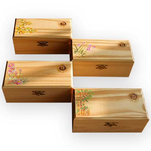 Hộp gỗ 6 ngăn gồm 6 gói trà xanh Tân cương 75gr Chất liệu hộp: Gỗ Hương hoặc Gỗ Thông nhập khẩu. Gia công: Chế tác thủ công tinh xảo, khắc laser logo thương hiệu. Đóng