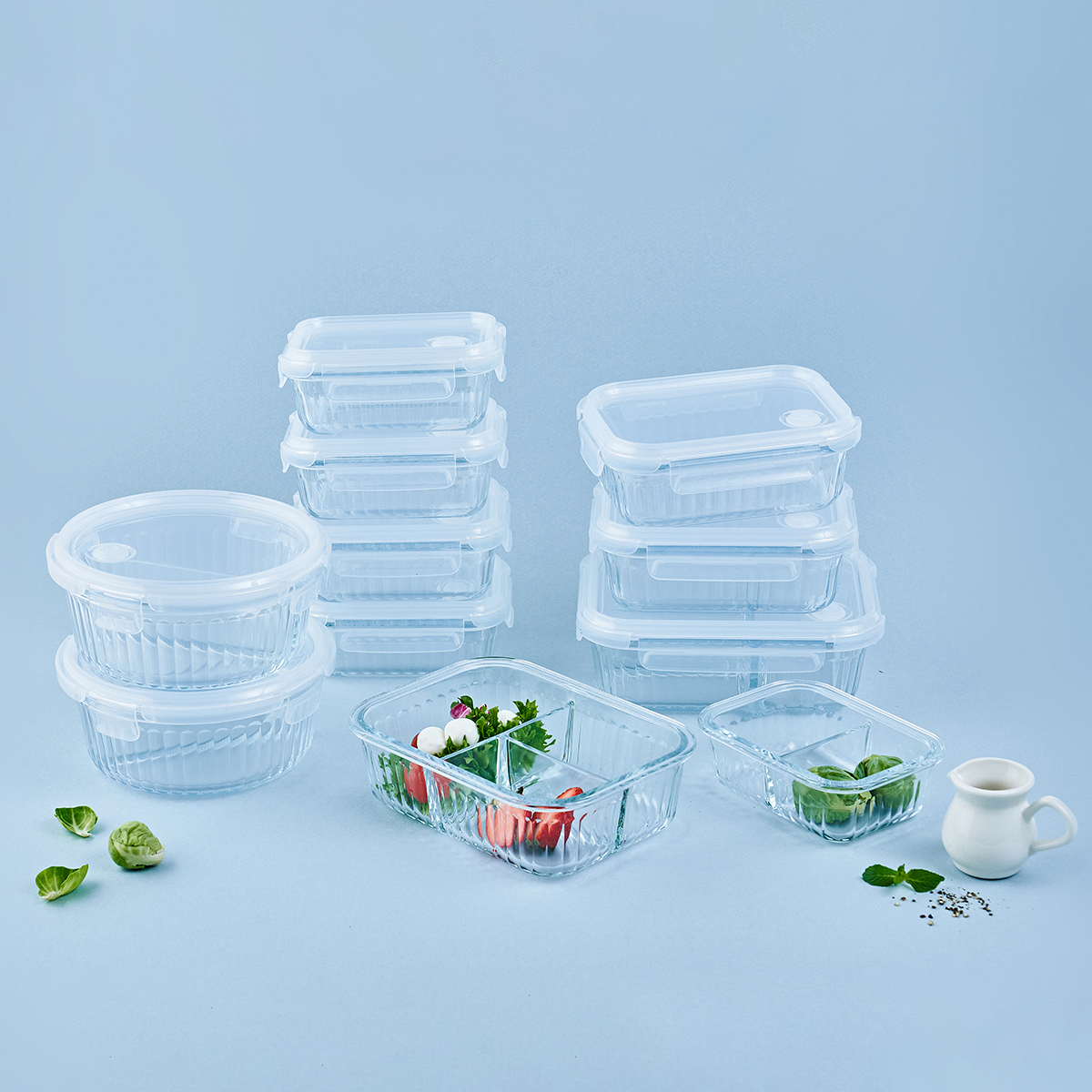 Bộ sản phẩm gồm: 1 hộp thủy tinh dung tích 380ml; kích thước: Ø10,5 x 5 cm 1 hộp thủy tinh dung tích 650ml; kích thước: Ø15,5 x 7,5 cm 1 hộp thủy tinh dung
