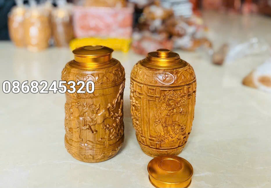 _ Hôp đựng trà chè được làm bằng chất liệu gỗ bách xanh liền khối tự nhiên 100% _ Kt cao 20×10cm _ Hộp được chạm khắc nhiều hoa văn khác nhau ,khắc tích tứ