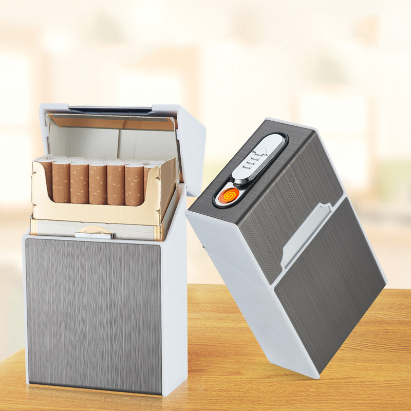 Hộp đựng thuốc l.á 20 điếu vỏ kim loại tích hợp bật lửa điện để mồi châm.