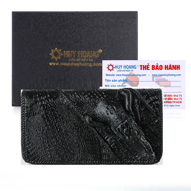 - Tên sản phẩm: Bóp nữ da cá sấu Huy Hoàng nhiều ngăn đầu cá sấu đan viền màu đen, nâu đất, vàng, nâu đỏ